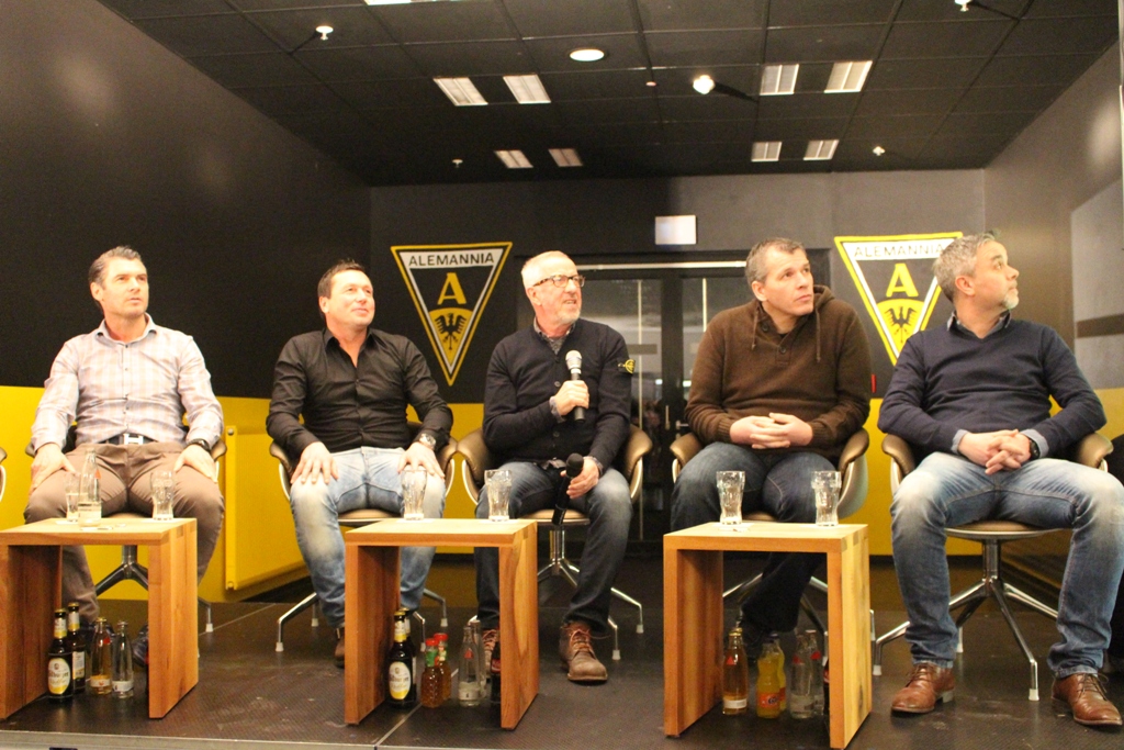 Aber nicht nur die Vergangenheit sollte an diesem Abend beleuchtet werden. Nach dem Motto „Gestern. Heute. Morgen.“ ging es im zweiten Teil um die aktuelle Situation des Klubs und einen Ausblick in die Zukunft. Vom Regionalliga-Team der Alemannia waren Co-Trainer Reiner Plaßhenrich und Sasa Strujic gekommen. Christoph Pauli (Zeitungsverlag Aachen) und Thomas Deutz, der auf der JHV für das Amt des Vize-Präsidenten kandidiert, stellten sich ebenfalls den Fragen von Stadionsprecher Robert Moonen. Einig waren sich am Ende alle in einem Punkt: „Nur wenn Ruhe in den Verein einkehrt, kann dauerhaft wieder erfolgreich gearbeitet werden.“