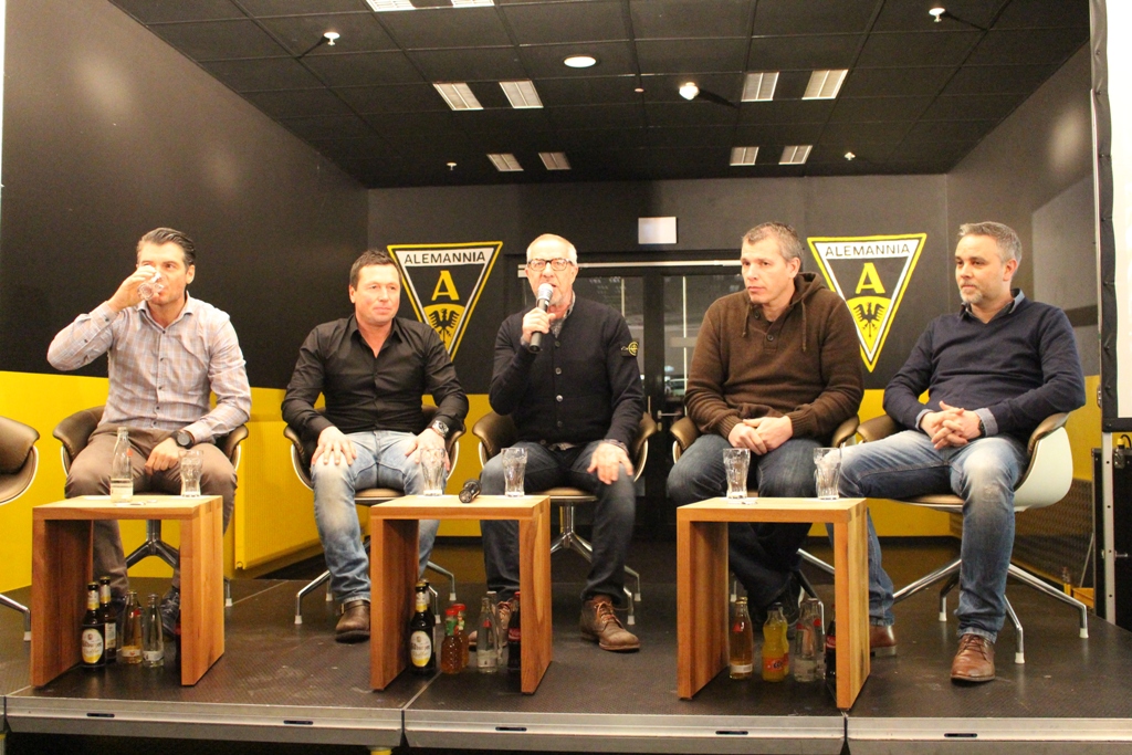 Von der damaligen Mannschaft waren Kapitän Karlheinz Pflipsen, Torwart Stephan Straub und Publikumsliebling Willi Landgraf zu Gast, die gemeinsam mit Kolumnist und Alemannia-Fan Sascha Theisen auf den legendären Pokalabend zurückblickten. „Der Schuss vom Blanki war nicht haltbar – basta“, witzelte Landgraf. „Wir haben früher die Molten-Bälle so hart aufgepumpt, dass der Gegner immer Probleme hatte. Wir kannten die Dinger, die waren steinhart“, und lieferte gleich die Erklärung, warum die Oliver Kahn die Flugkurve des Balls nicht einschätzen konnte.