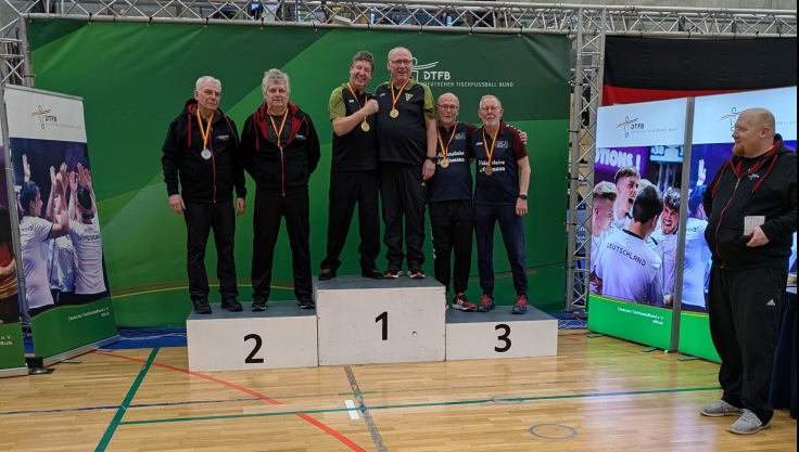 Die Alemannia-Spieler der Abteilung Tischfußball, Manfred Görtges und Karl-Heinz Gebhardt, errangen dabei den obersten Platz auf dem Treppchen im Senioren-Doppel Ü63 und sind nun Deutsche Meister 2025.