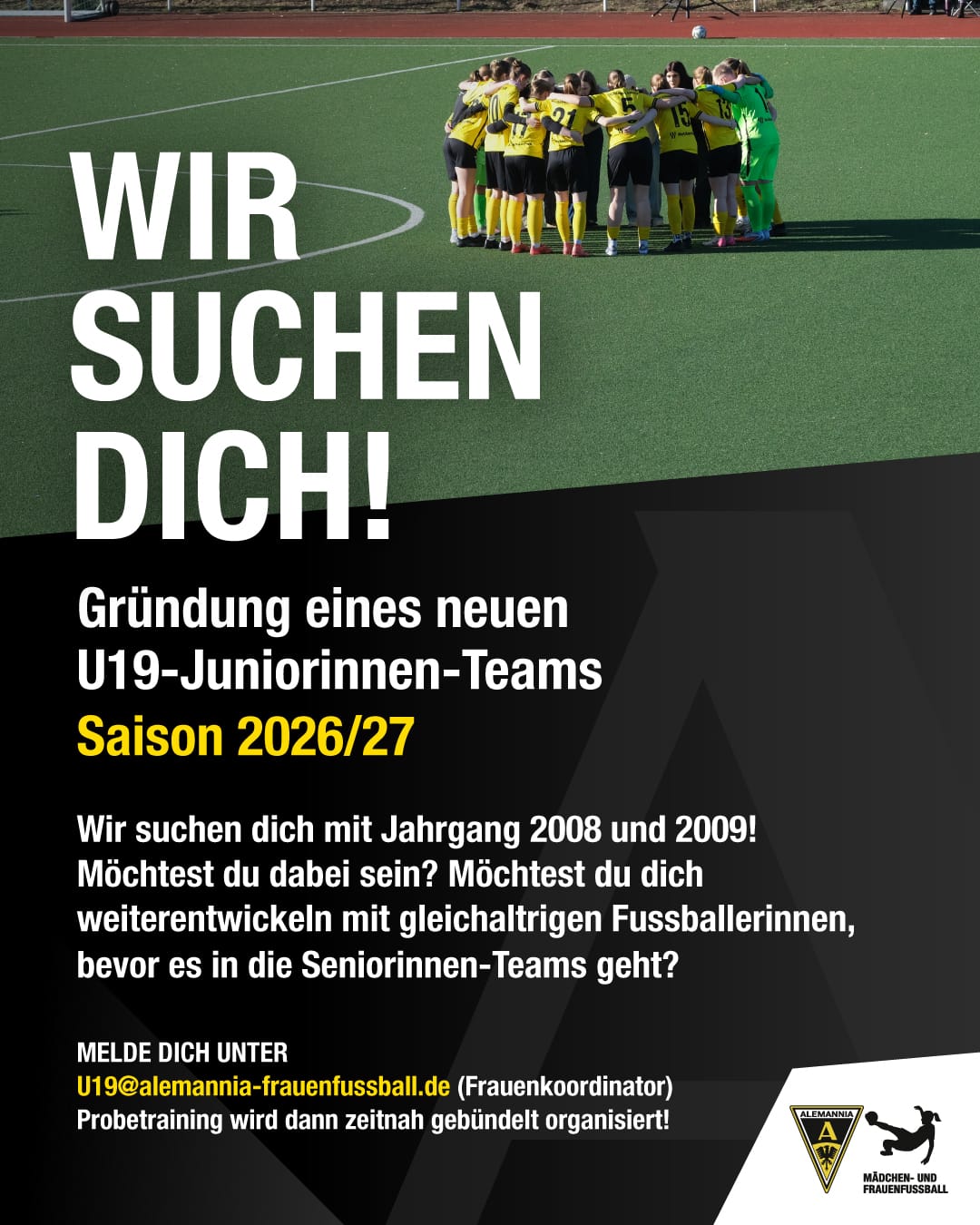 Zur Saison 2026/27 gründet die Frauenabteilung von Alemannia Aachen eine neue U19-Juniorinnen-Mannschaft. Damit ist Schwarz-Gelb der einzige Verein in Aachen, der ein Team in dieser Altersklasse stellt.