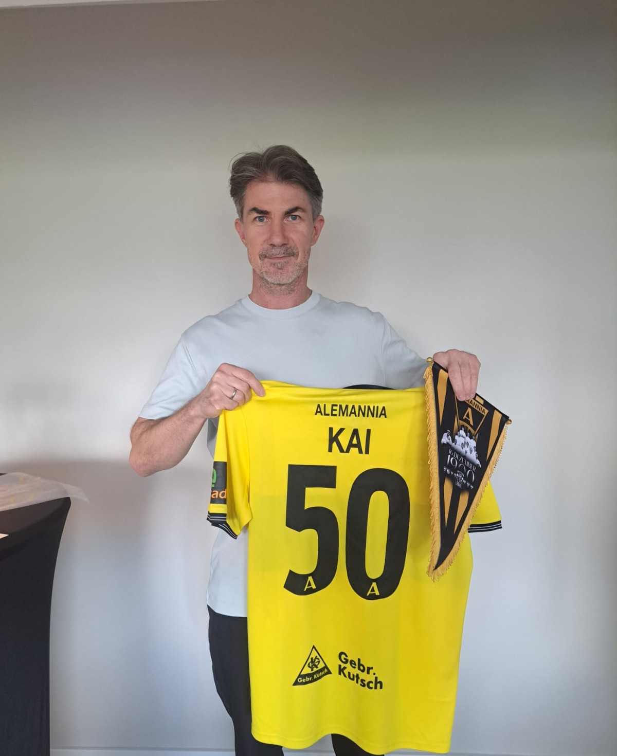 Alemannias ehemaliger Spieler Kai Michalke ist heute 50 Jahre alt geworden. Zu seinem Ehrentag wurde das Geburtstagskind von Präsidiumsmitglied André Beckers besucht, der ihm im Namen des Vereins sowie des restlichen Präsidiums ein Trikot mit seinem Namen drauf überreichte.