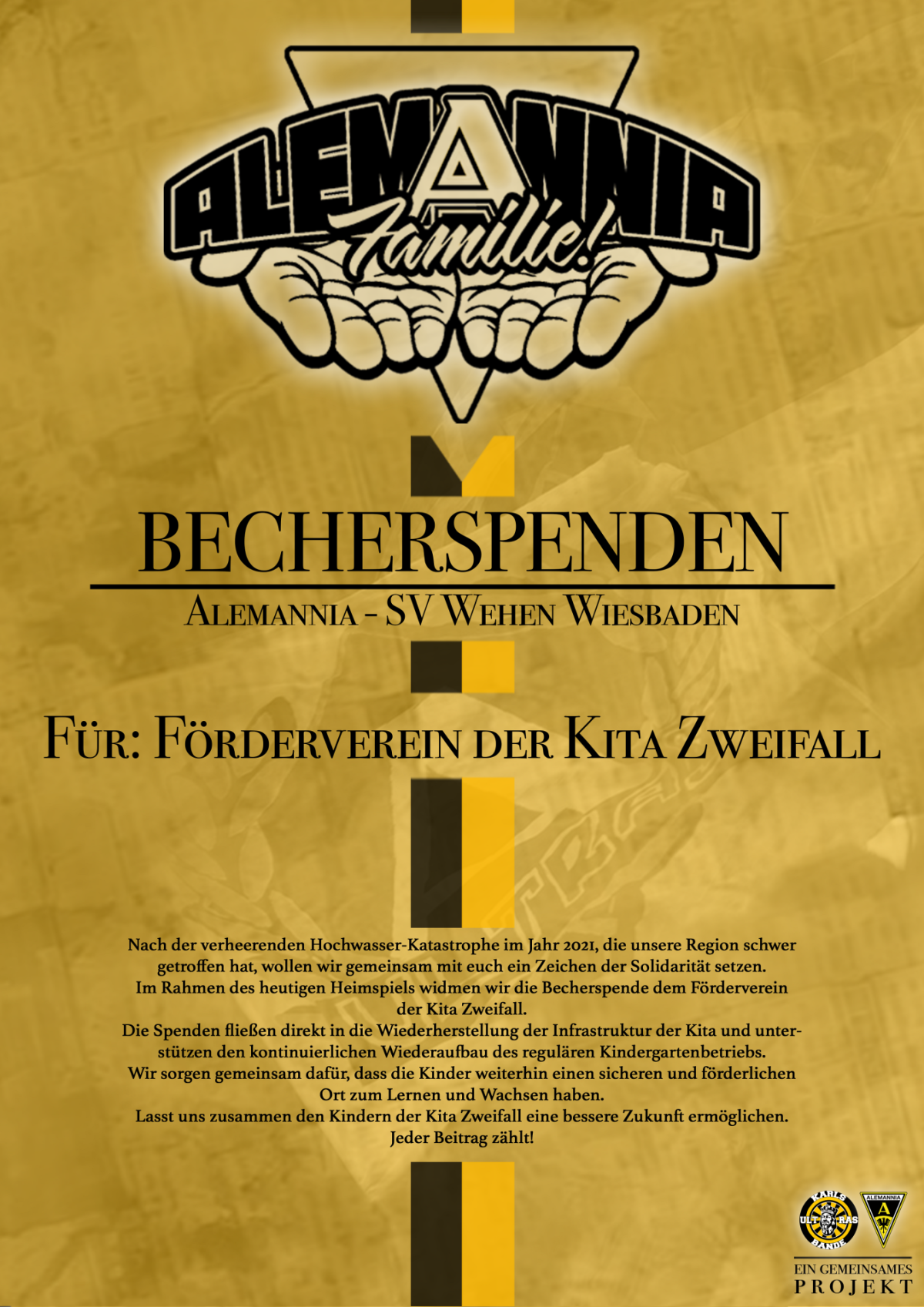 Fans haben auch beim heuteigen Heimspiel gegen den SV Wehen Wiesbaden die Möglichkeit, ihr Becherpfand zu spenden. Die Gelder kommen dabei komplett der Kita Zweifall zu Gute, welche durch die Flutkatastrophe 2021 beschädigt.