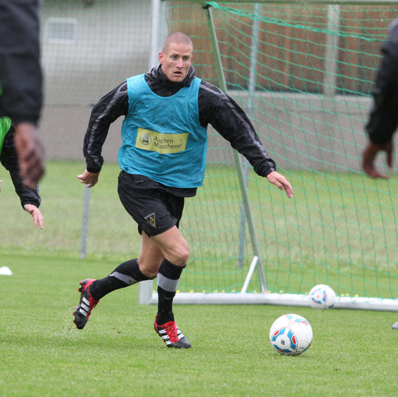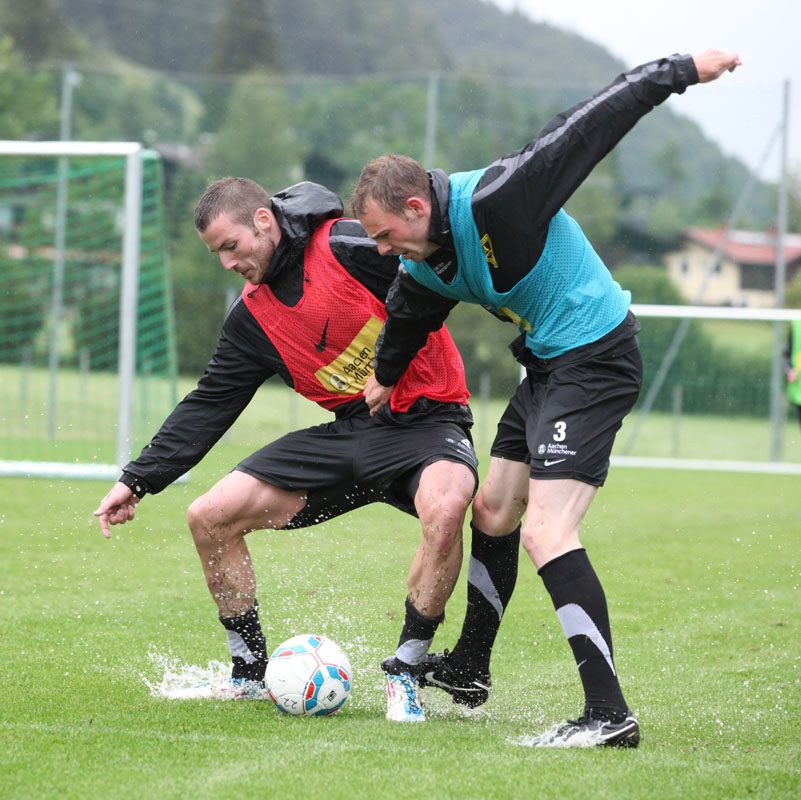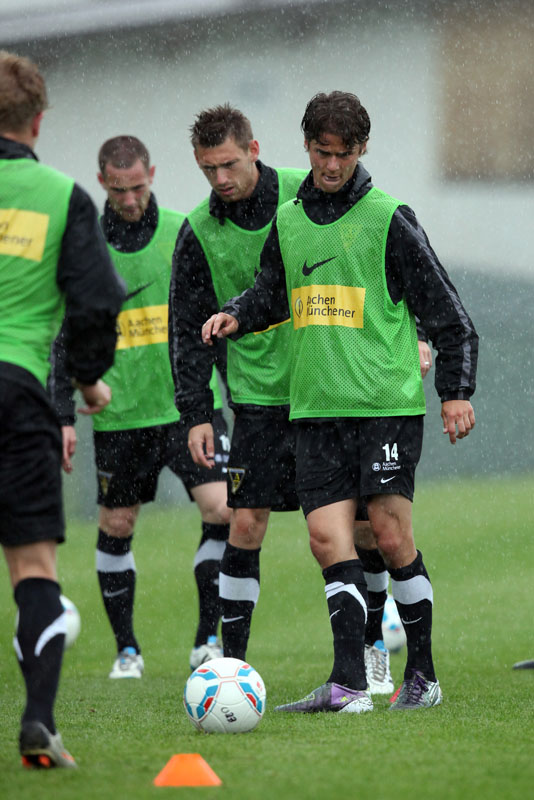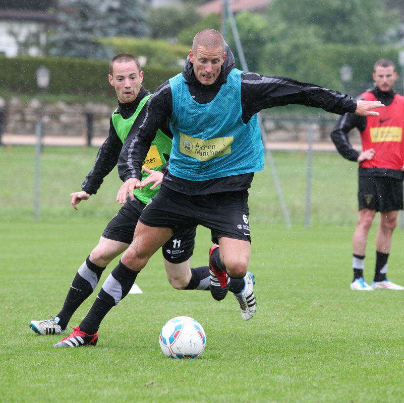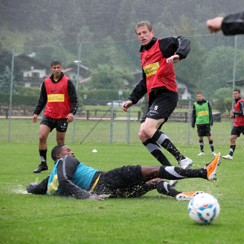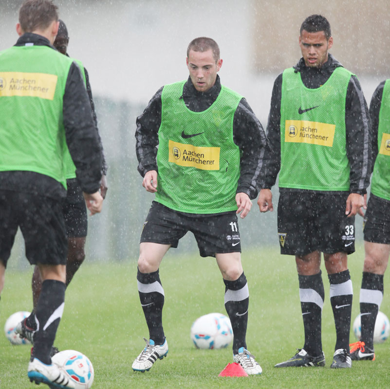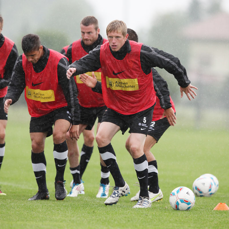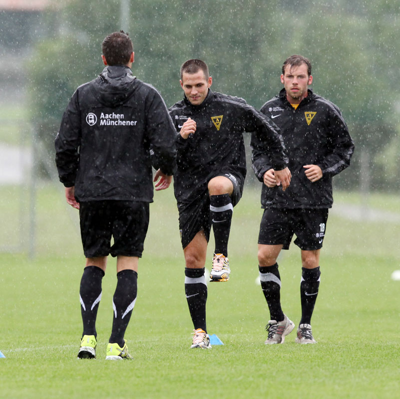 „Männer, das war ein echt starkes Training!“ Zum Abschluss rief Peter Hyballa das Team am kleinen Materialhäuschen noch einmal zusammen, um seine Einschätzung der Einheit abzugeben. Für Aachener Verhältnisse kurz, aber dafür unheimlich intensiv ging es zur Sache. Der Boden tat sein Übriges, dem Sturm am Vorabend waren ergiebige Regengüsse gefolgt. „Das sind die Einheiten, die uns Fußballern Spaß machen“, sagt Fabian Bäcker, dessen Vorbereitung unglücklich begann. Das Knie reagierte gereizt, die Physiotherapeuten bauten den Neuzugang von Borussia Mönchengladbach in den ersten zweieinhalb Wochen kontinuierlich auf.