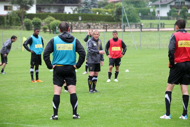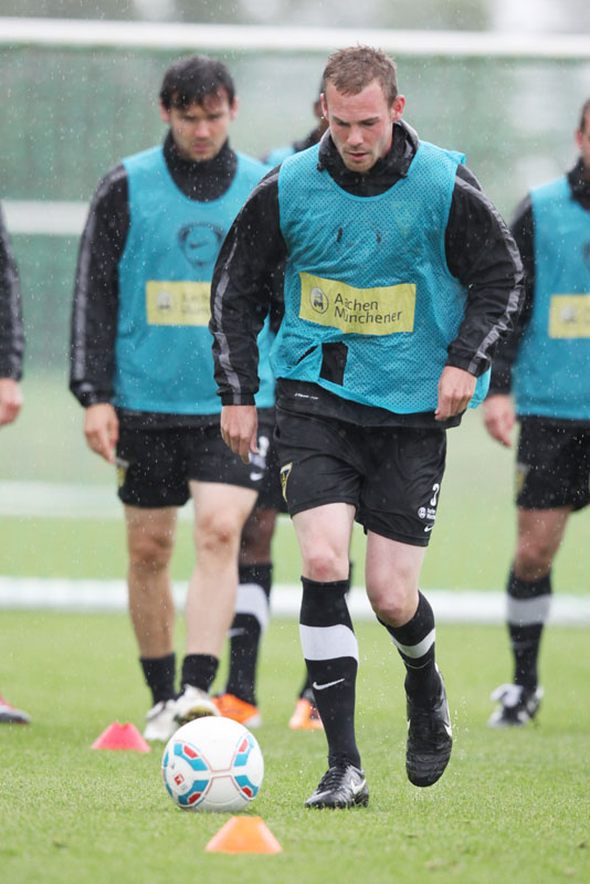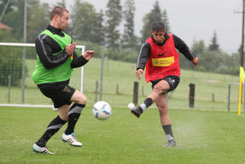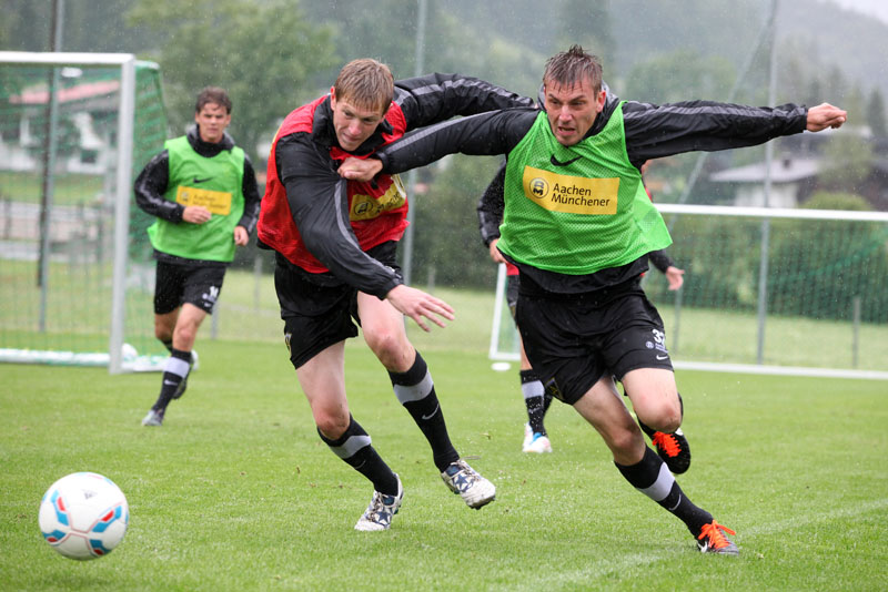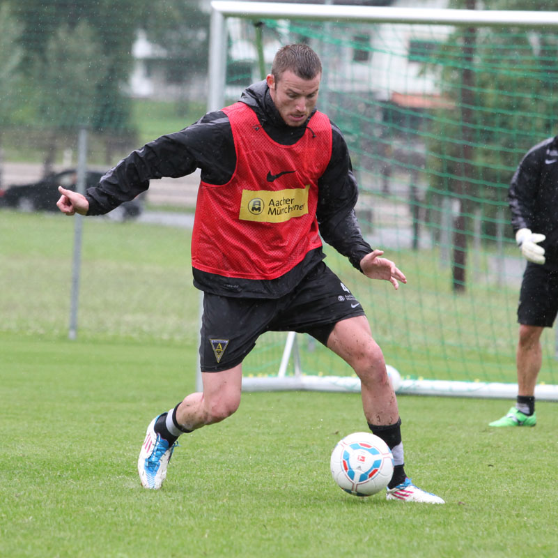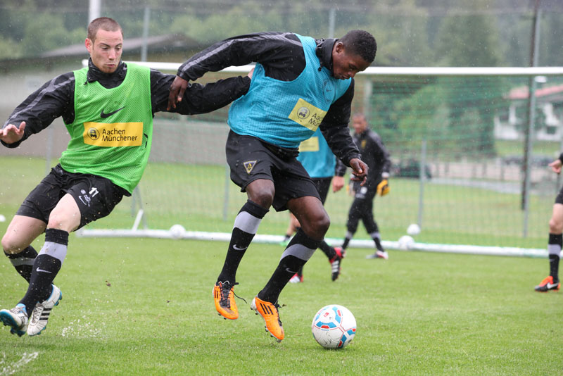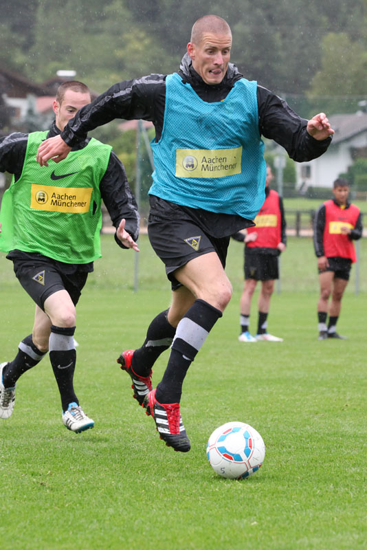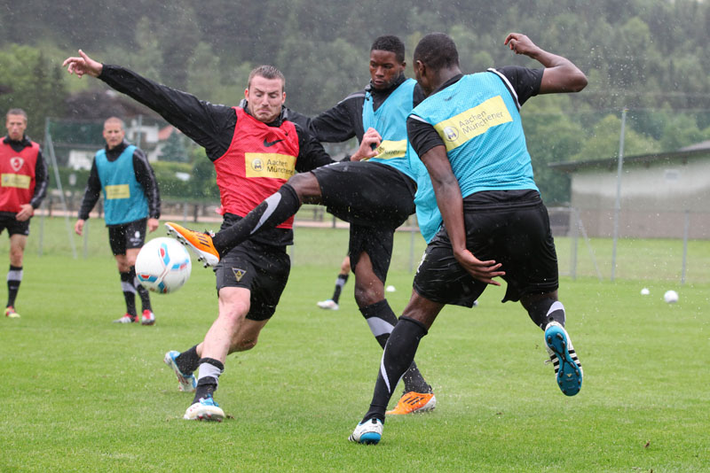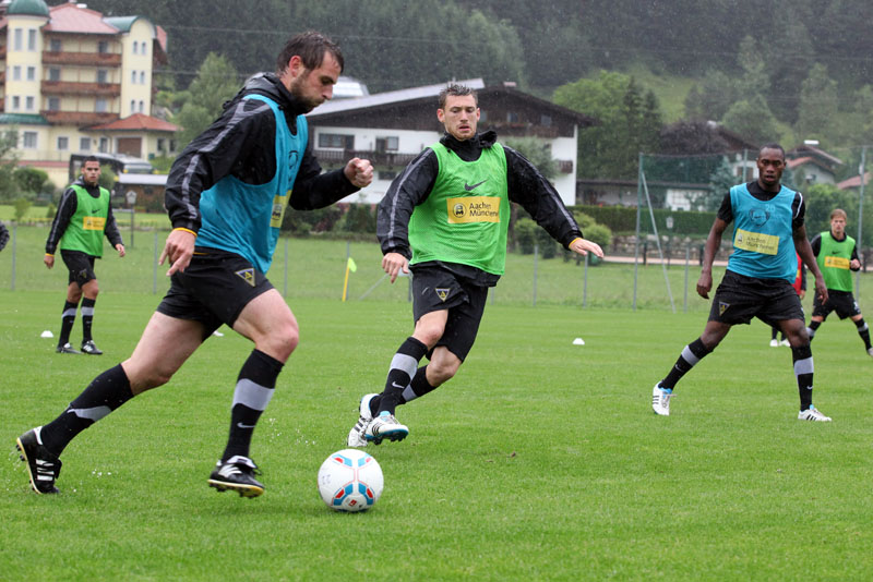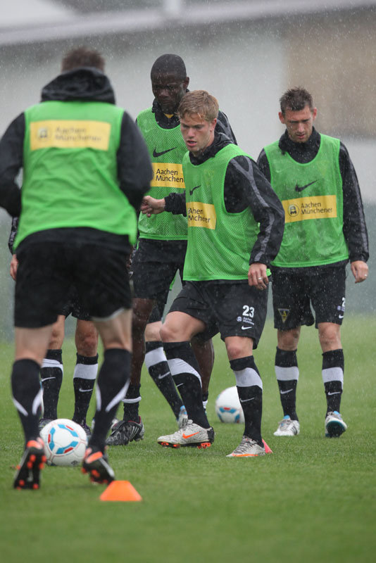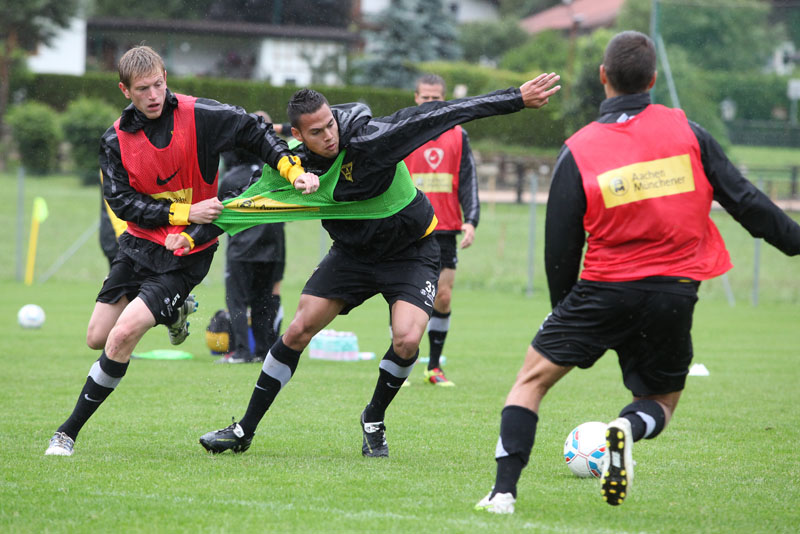 „Männer, das war ein echt starkes Training!“ Zum Abschluss rief Peter Hyballa das Team am kleinen Materialhäuschen noch einmal zusammen, um seine Einschätzung der Einheit abzugeben. Für Aachener Verhältnisse kurz, aber dafür unheimlich intensiv ging es zur Sache. Der Boden tat sein Übriges, dem Sturm am Vorabend waren ergiebige Regengüsse gefolgt. „Das sind die Einheiten, die uns Fußballern Spaß machen“, sagt Fabian Bäcker, dessen Vorbereitung unglücklich begann. Das Knie reagierte gereizt, die Physiotherapeuten bauten den Neuzugang von Borussia Mönchengladbach in den ersten zweieinhalb Wochen kontinuierlich auf.