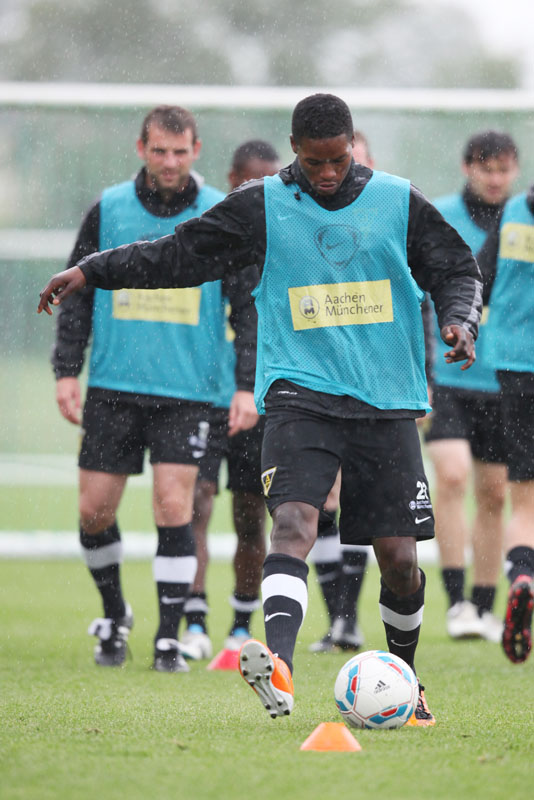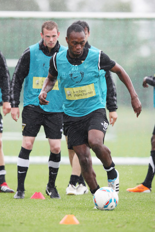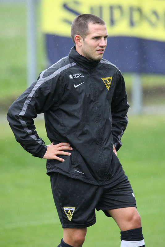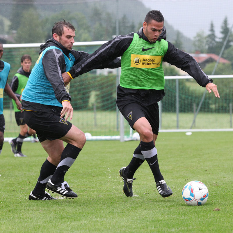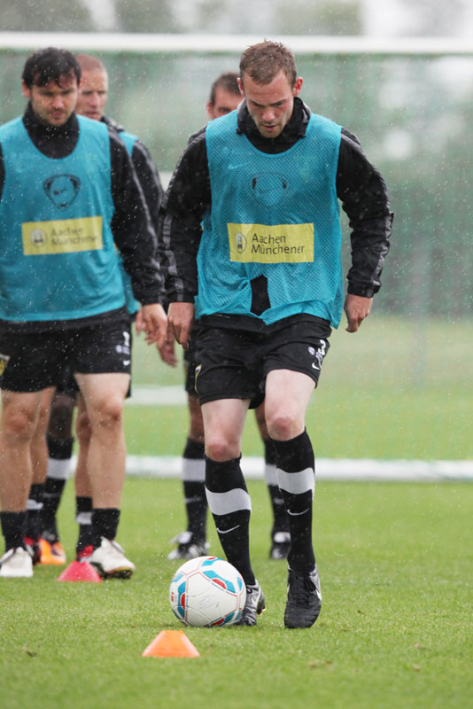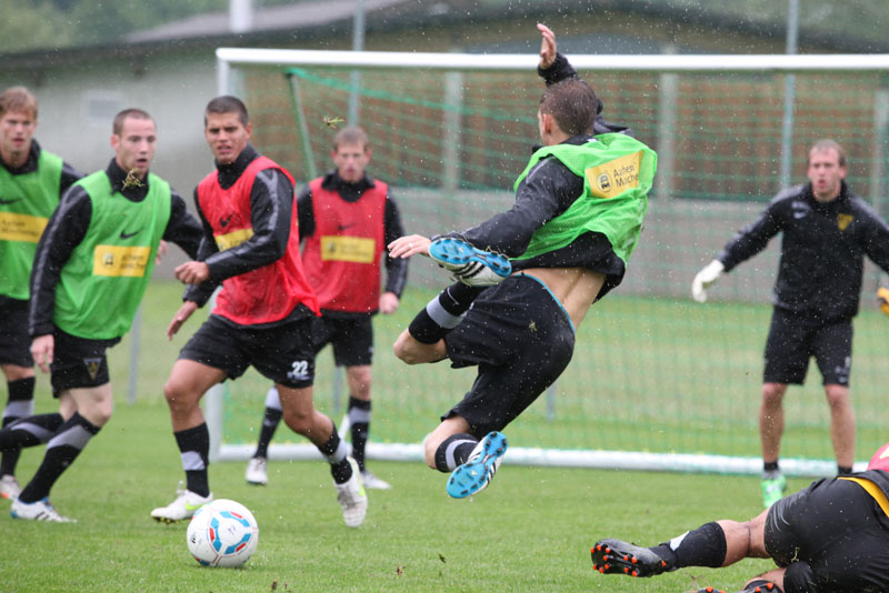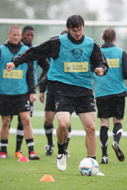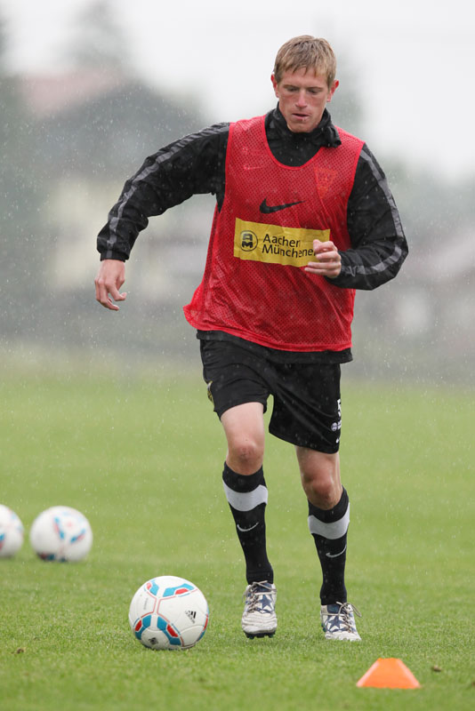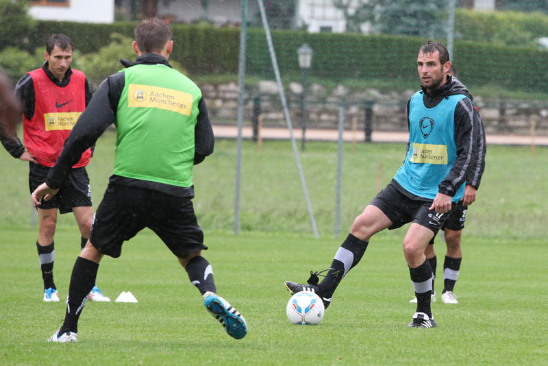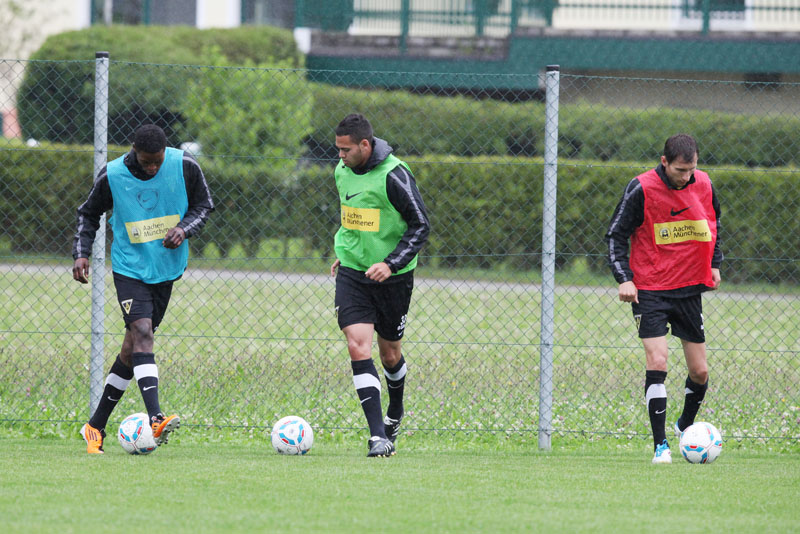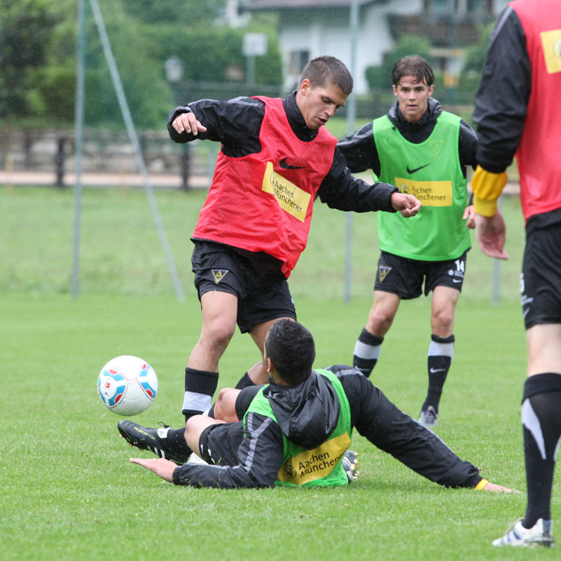 „Männer, das war ein echt starkes Training!“ Zum Abschluss rief Peter Hyballa das Team am kleinen Materialhäuschen noch einmal zusammen, um seine Einschätzung der Einheit abzugeben. Für Aachener Verhältnisse kurz, aber dafür unheimlich intensiv ging es zur Sache. Der Boden tat sein Übriges, dem Sturm am Vorabend waren ergiebige Regengüsse gefolgt. „Das sind die Einheiten, die uns Fußballern Spaß machen“, sagt Fabian Bäcker, dessen Vorbereitung unglücklich begann. Das Knie reagierte gereizt, die Physiotherapeuten bauten den Neuzugang von Borussia Mönchengladbach in den ersten zweieinhalb Wochen kontinuierlich auf.