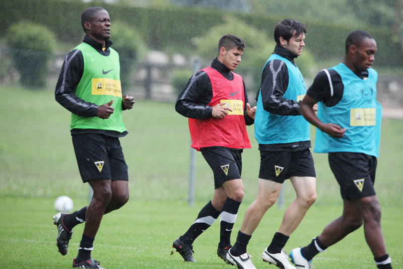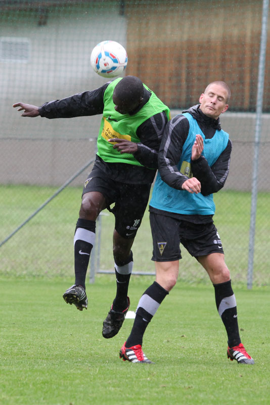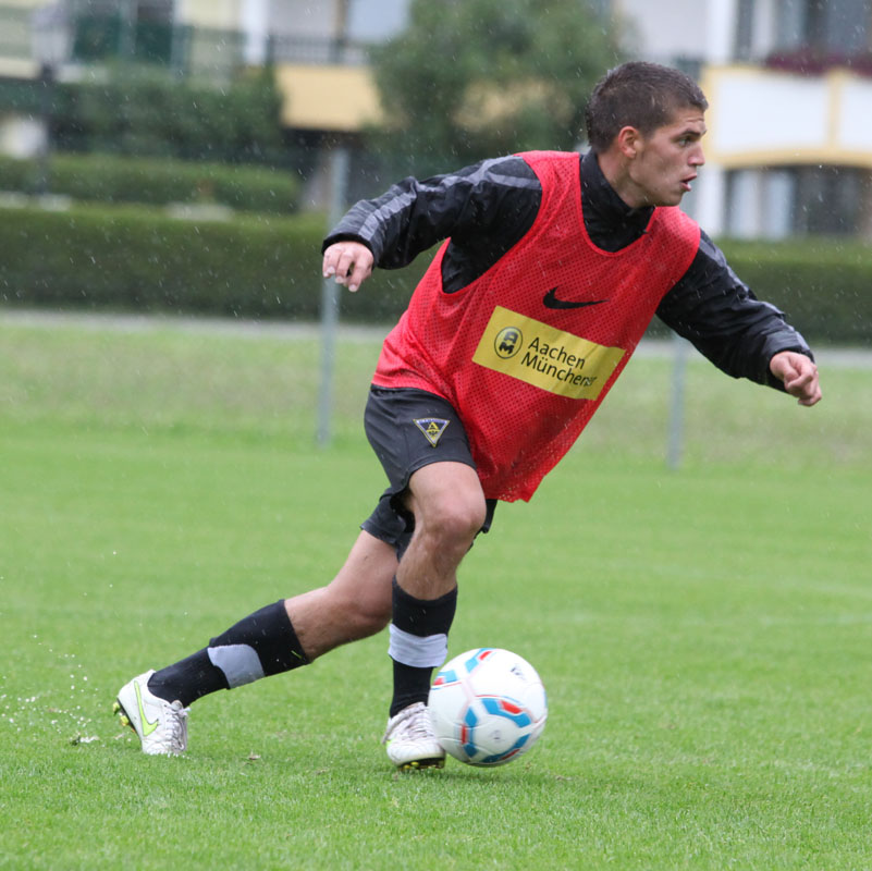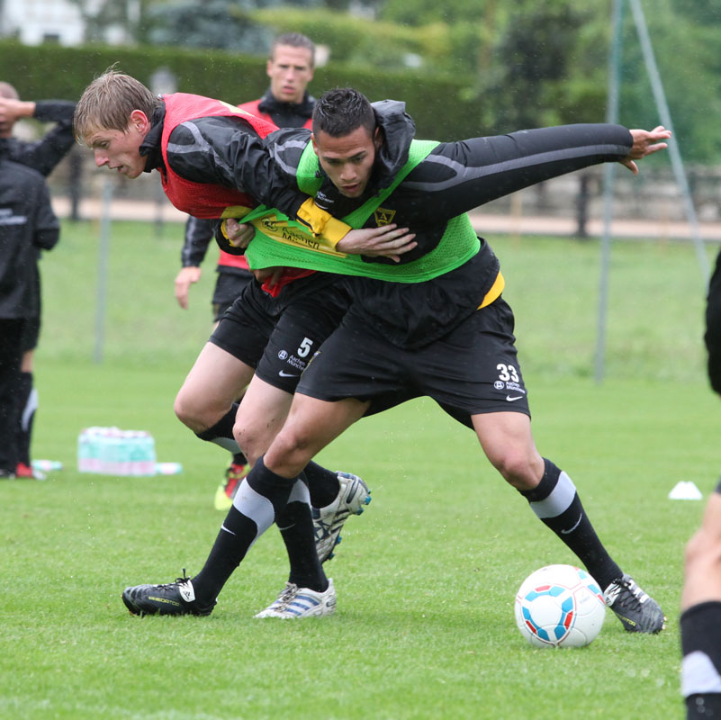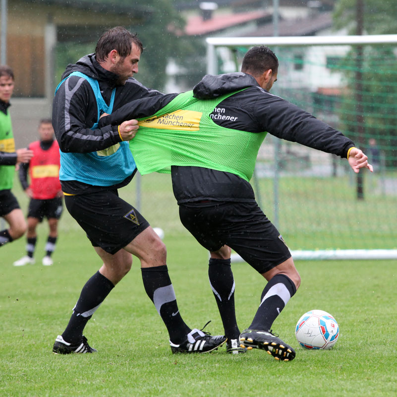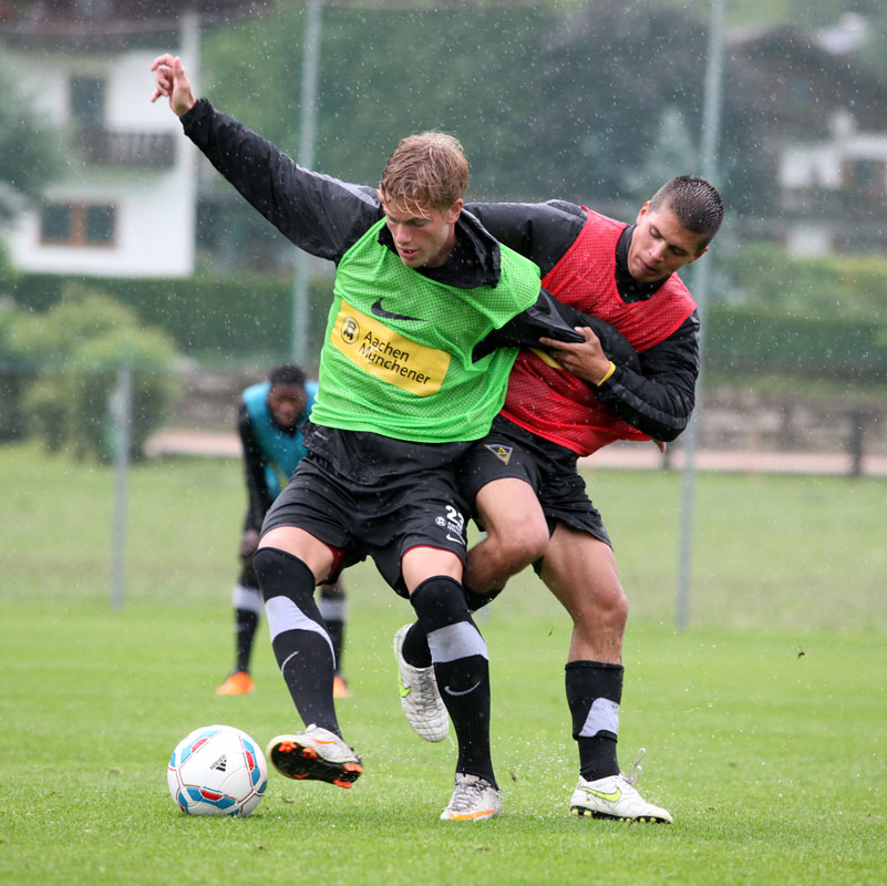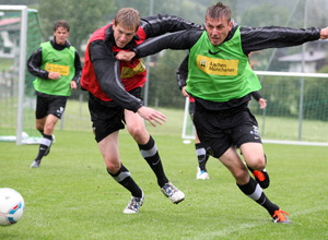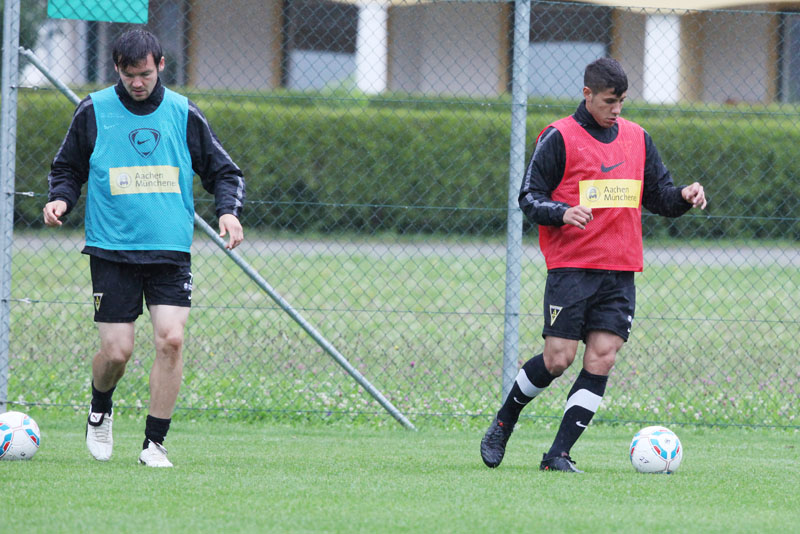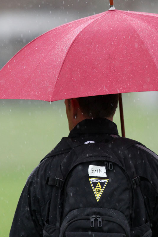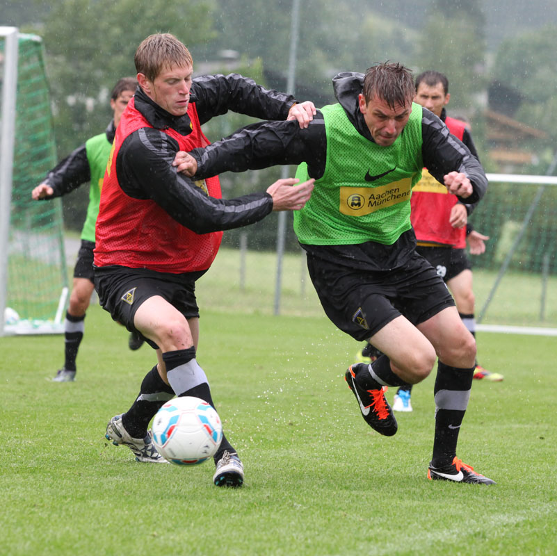 „Männer, das war ein echt starkes Training!“ Zum Abschluss rief Peter Hyballa das Team am kleinen Materialhäuschen noch einmal zusammen, um seine Einschätzung der Einheit abzugeben. Für Aachener Verhältnisse kurz, aber dafür unheimlich intensiv ging es zur Sache. Der Boden tat sein Übriges, dem Sturm am Vorabend waren ergiebige Regengüsse gefolgt. „Das sind die Einheiten, die uns Fußballern Spaß machen“, sagt Fabian Bäcker, dessen Vorbereitung unglücklich begann. Das Knie reagierte gereizt, die Physiotherapeuten bauten den Neuzugang von Borussia Mönchengladbach in den ersten zweieinhalb Wochen kontinuierlich auf.