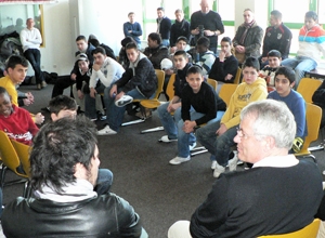 Knapp 30 Schülerinnen und Schüler der Gemeinschafts-Hauptschule Aretzstraße hatten am Mittwoch Gelegenheit zu einer besonderen Fragerunde. Zu Gast im Musikraum der Schule waren Alemannia-Präsident Dr. Alfred Nachtsheim, die Spieler Cristian Fiel und Aimen Demai sowie Frank Pieper, der Leiter des Nachwuchsleistungszentrums.