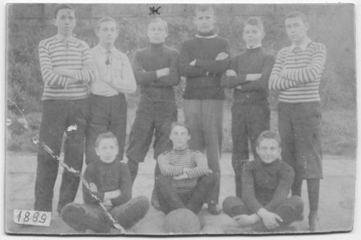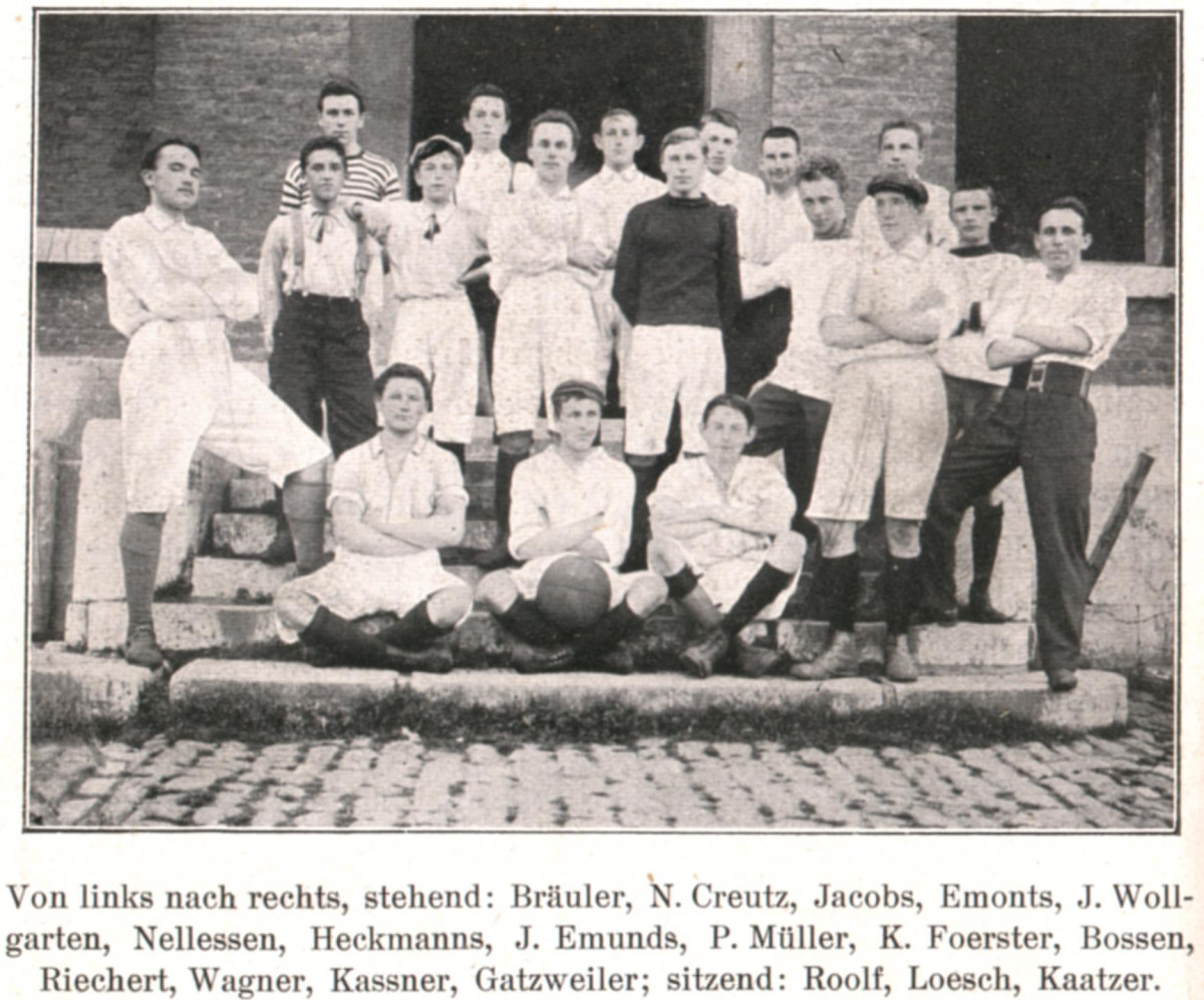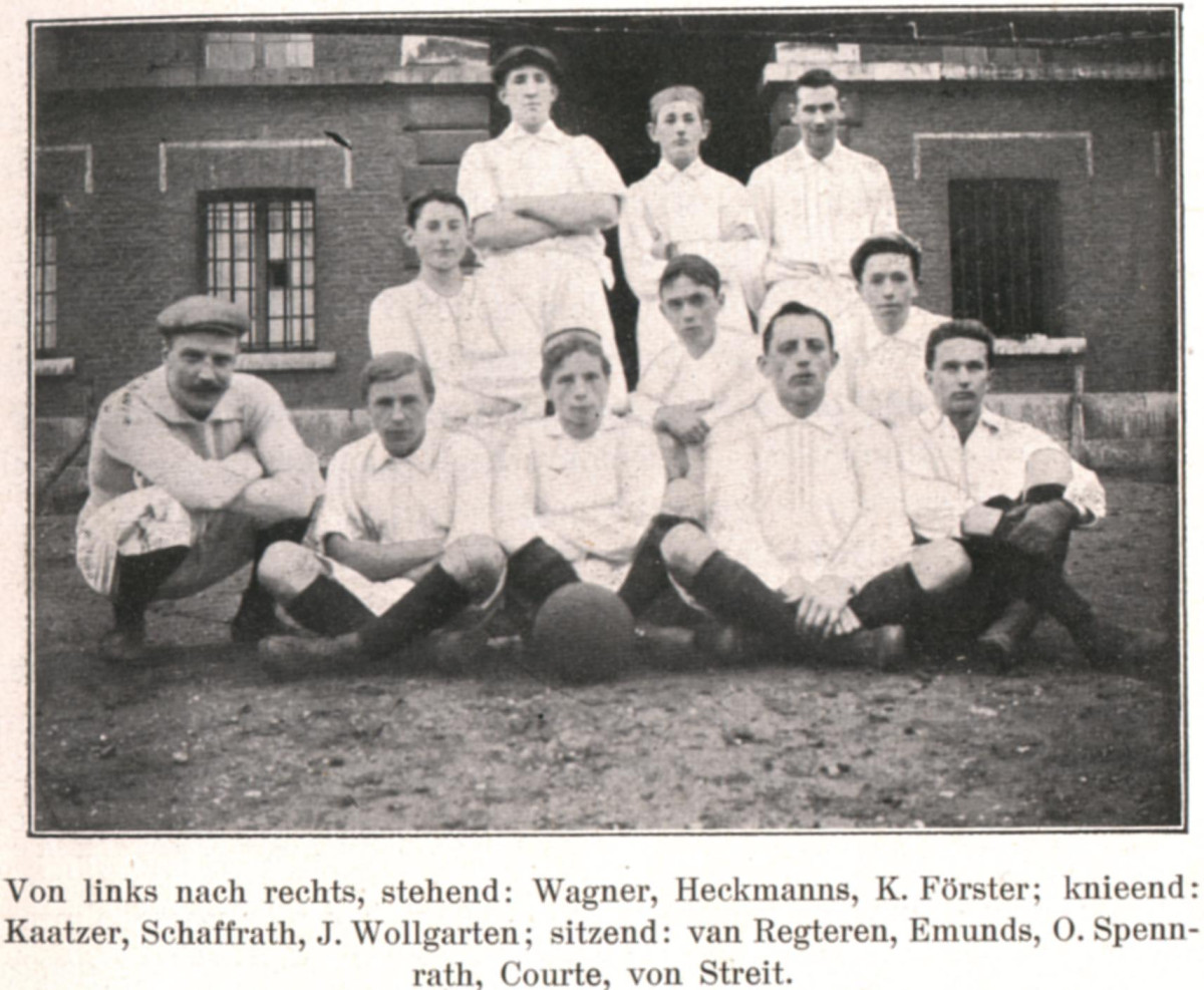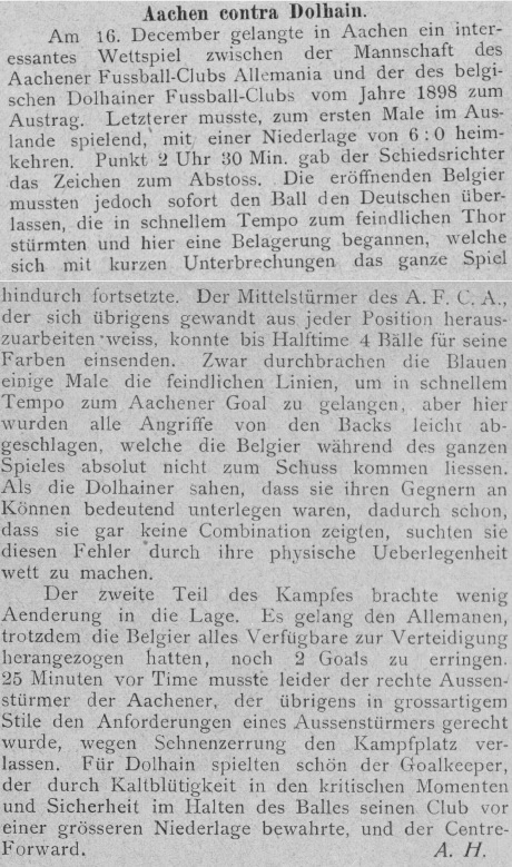 „Der monatliche Beitrag der Mitglieder betrug 30 Pfg. Das so erzielte bescheidene Einkommen des Vereins wurde zur Anschaffung und Instandhaltung "des Vereinsballs" und der Tore verwandt. Netze gabs bis 1905 nicht. Die Torstangen waren rund, und durch eine Leine verbunden. An Eintrittsgelder bei Wettspielen war nicht zu denken, da der Platz nur Mitgliedern des Vereins für Jugend- und Volksspiele zugänglich war. Die fremden Mannschaften konnten nur durch Ueberredung des militärischen Postens oder auf Schleichwegen auf den Platz gebracht werden. Die Kleidung der Spieler war weisses Hemd und kurze weisse Hose; die Aachener Stadtfarben hatte der Aachener F.C. vorweg genommen. Schon am 16. Dezember 1900 war das erste Wettspiel. In schönem, überlegenen Spiel besiegte unsere Mannschaft auf dem Marienthaler Kasernenhof den F.C. Dolhain mit 6:0.“
