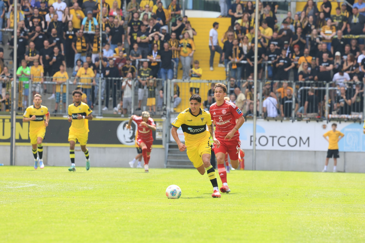Die Schwarz-Gelben empfingen im Rahmen der Saisonvorbereitung Fortuna Düsseldorf aus der 2. Bundesliga auf dem Tivoli. Die Düsseldorfer waren früh im Spiel um Ballkontrolle bemüht und ließen den Ball durch die eigenen Reihen laufen. Die Alemannia auf der anderen Seite konzentrierte sich vor allem auf die Defensive. Mit der Zeit erhöhten die Fortunen jedoch immer mehr den Druck – vor allem über ihre rechte Seite mit Matthias Zimmermann und Christian Rasmussen. So war es schließlich auch ein Steckpass auf Rasmussen, der das erste Mal für Gefahr sorgte – Olschowsky klärte den Schuss des Düsseldorfers aber (9.). Einige Minuten später sah es dann anders aus: Ein Rückpass auf Olschowsky misslang und Immanuel Iyoha schob ins leere Tor ein (20.).