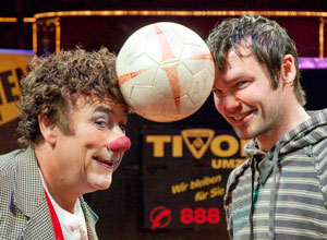 Für Auer hingegen war die Gewöhnung an das neue Schuhwerk offensichtlich schwieriger als für den Clown an den Ball, wie sich beim Zielen auf die Torwand zeigte. Abwechselndes Schießen erst oben links, dann unten rechts war die Vorgabe. Nicht selten landeten gerade Bennys Bälle in den Logen der Manege oder im Vorhang. Untypisch für den gewohnt zielsicheren Schützen. „Ich hatte doch so meine Probleme mit den neuen Schuhen. Ich weiß gar nicht, wie oft ich die Wand sogar komplett verfehlt habe“, erklärte Auer. Am Ende genügte dem Clown ein Treffer unten rechts, um den Sieg für den Roncalli einzufahren. In der Manier eines Fußballers ließ sich Larible nach dem verwandelten Schuss zum 1:0 Endstand auf die Knie fallen und riss sich sein Hemd über den Kopf. Hierfür hätte er auf dem Fußballfeld wohl die Gelbe Karte gesehen, in der Manege hingegen waren ihm der Beifall und Jubel der Zuschauer sicher − wie es sich für einen Clown eben gehört. „Natürlich ist es sehr bitter, gegen den Clown zu verlieren. Ich habe sicherlich noch Übungsbedarf“, bekundete Auer mit einem Lächeln auf dem Gesicht.