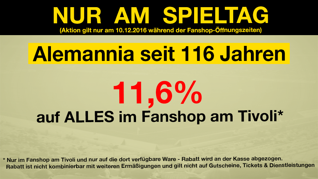 In Anlehnung an den 116. Geburtstag, den die Alemannia am 16. Dezember feiert, gibt es im Fanshop am Tivoli am Spieltag 11,6 Prozent Rabatt auf alle Fanartikel. Der Shop öffnet am Samstag um 10 Uhr.