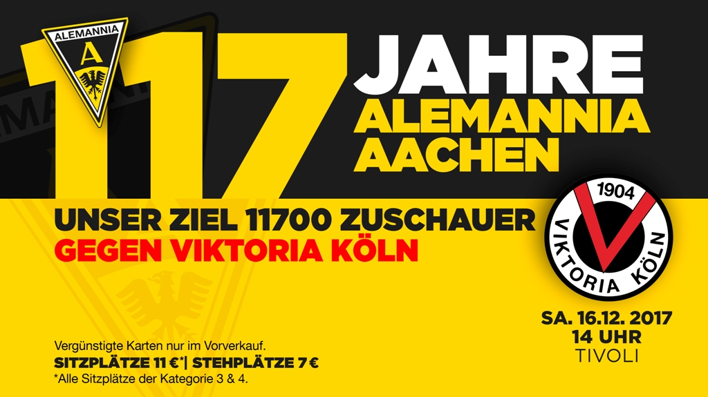 Alemannia Aachen wird stolze 117 Jahre alt. Am 16. Dezember feiern die Schwarz-Gelben mit dem letzten Heimspiel des Jahres gegen Viktoria Köln ihren Geburtstag. Feiert mit uns!
