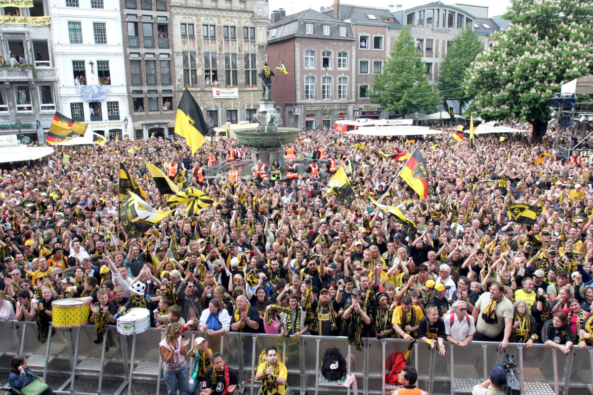 Es war ein Ostersonntag, der für immer in Erinnerung bleiben sollte. Während sich die Mannschaft im Café Madrid auf der Pontstraße versammelt hatte, richteten sich alle Blicke nach Saarbrücken. Dort verlor Verfolger Greuther Fürth mit 0:1 – und plötzlich war klar: Die Alemannia ist nach 36 Jahren zurück in der Bundesliga. Was folgte, war eine Nacht, in der Aachen den Schlaf vergaß. Spieler und Fans feierten gemeinsam, tanzten auf Tischen, und die Polizei musste die Pontstraße zeitweise sperren, weil immer mehr Schwarz-Gelbe dazustießen.