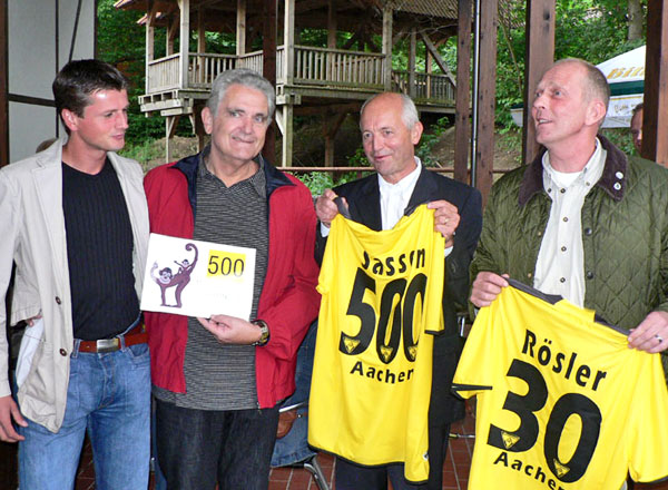 Und dort gibt es kein Halten mehr, ob Alemannia-Spieler oder nicht, die quirligen Nasenbären kriegen von den leckeren Keksen nicht genug und scheuen sich auch nicht davor, auf die Schulter zu springen oder am Hosenbein hochzuklettern. Ganz zur Freude der beiden.
