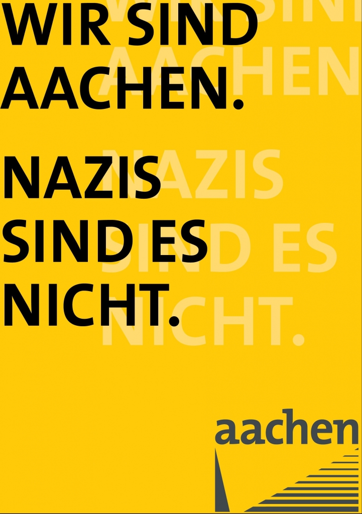 Am kommenden Samstag, 29. März, wird ein breites Bündnis der Aachener Bürgerschaft zur geplanten Demonstration von Neonazis erneut Flagge zeigen. Auch die Alemannia, als größter Sportverein der Stadt, unterstützt den Aufruf zur Gegendemonstration, die unter dem Motto „Wir sind Aachen – Nazis sind es nicht“ steht. Samstagabend wird ab 18 Uhr am Elisenbrunnen in der Aachener Innenstadt ein abwechslungsreiches Kulturprogramm geboten. Initiator ist der „Runde Tisch gegen Rechtsextremismus“ der Stadt Aachen, der im September 2010 gegründet wurde.