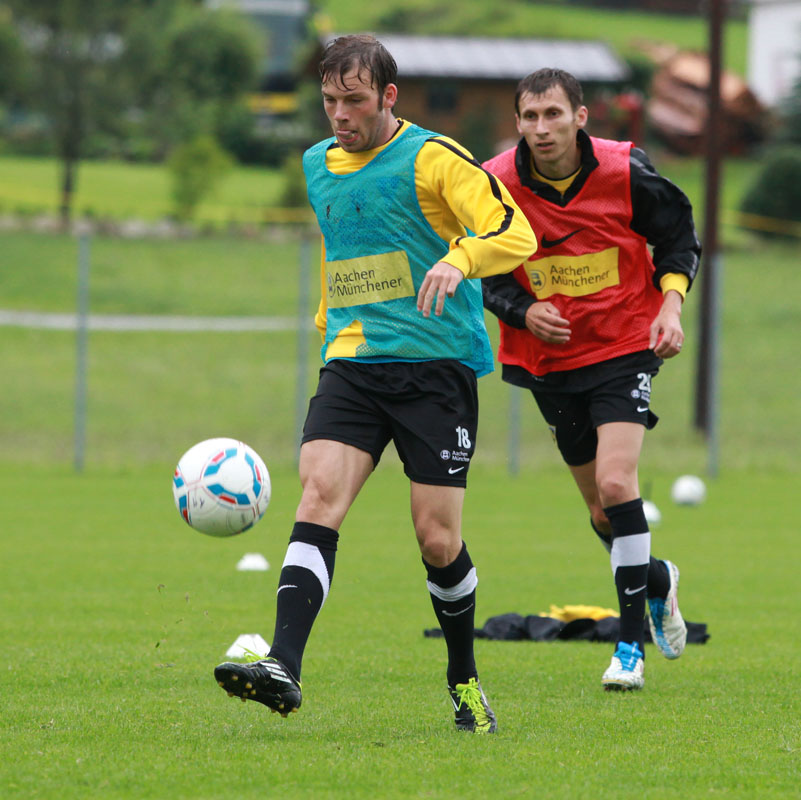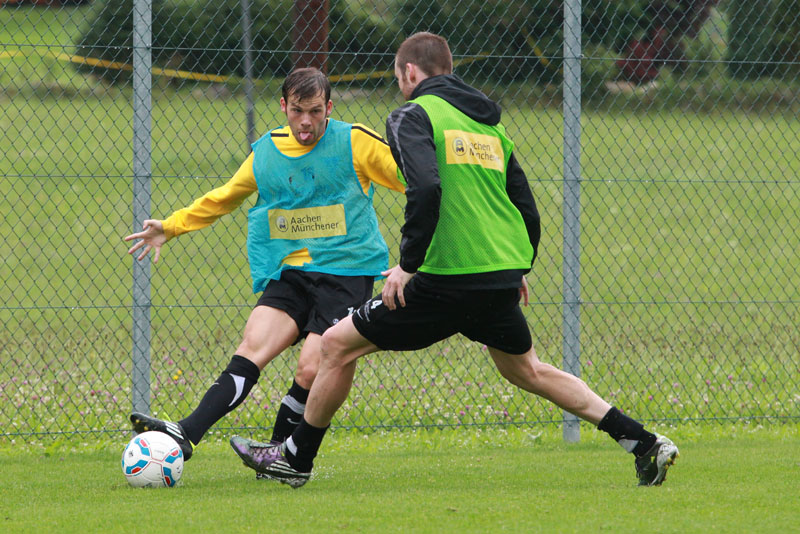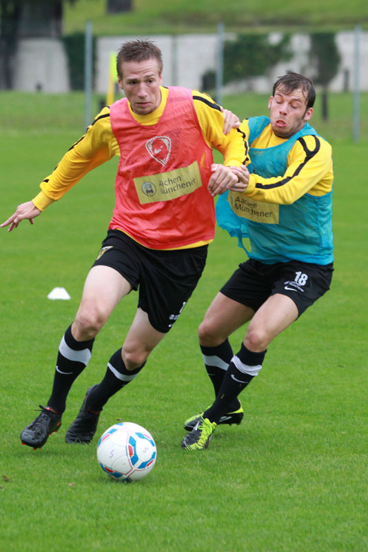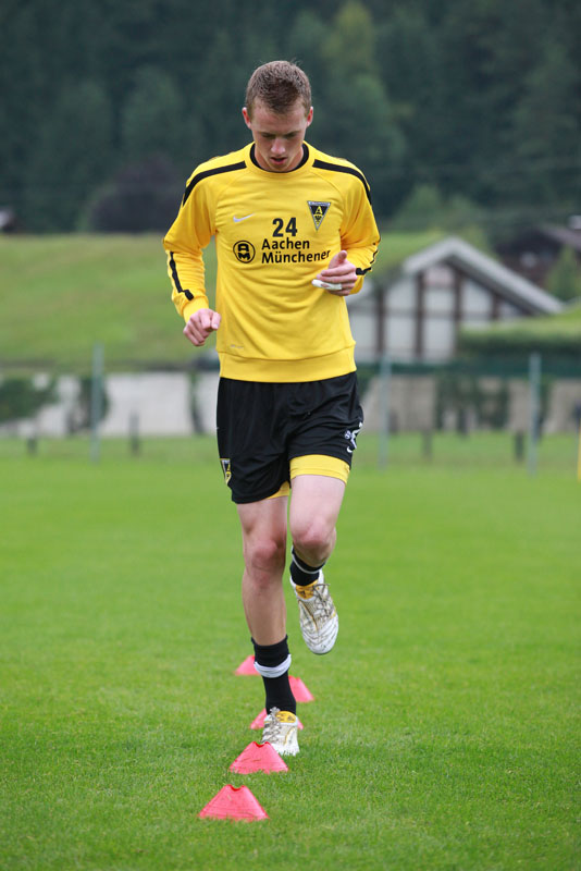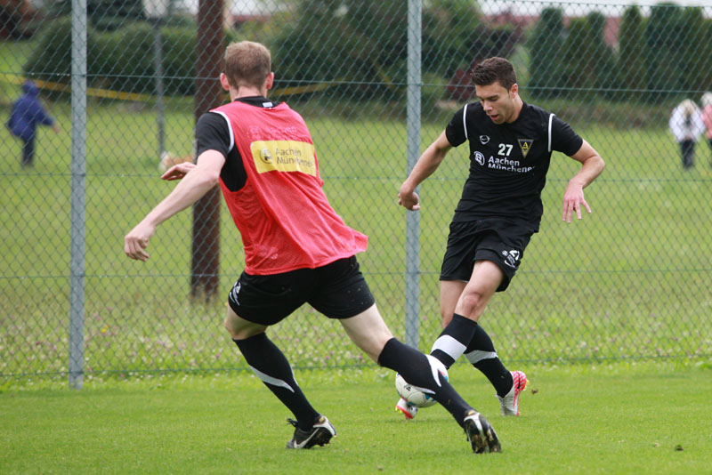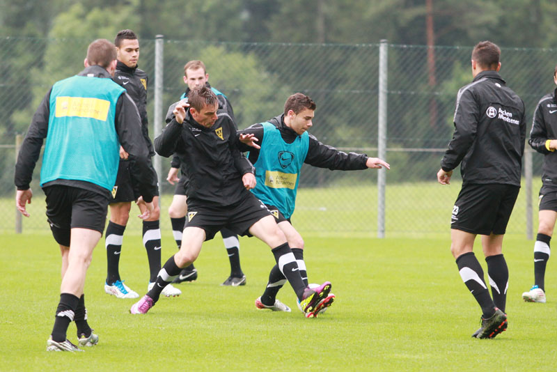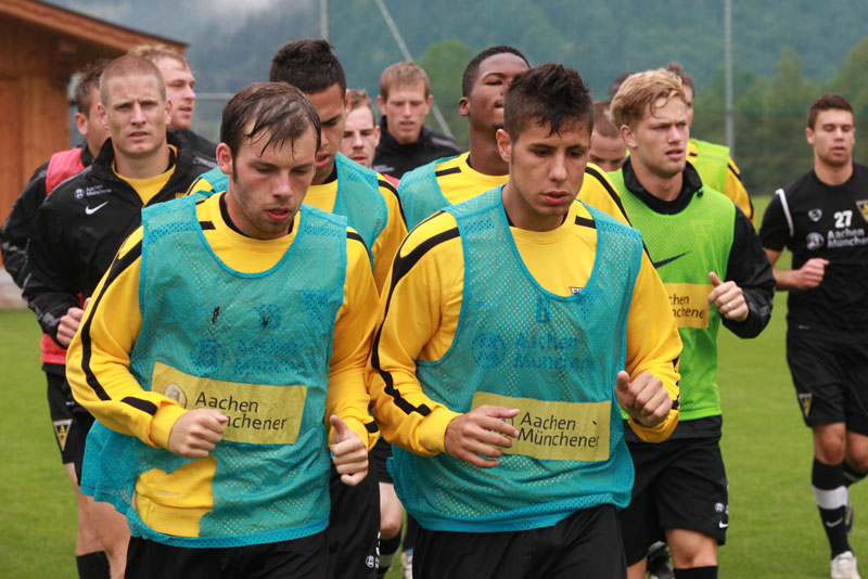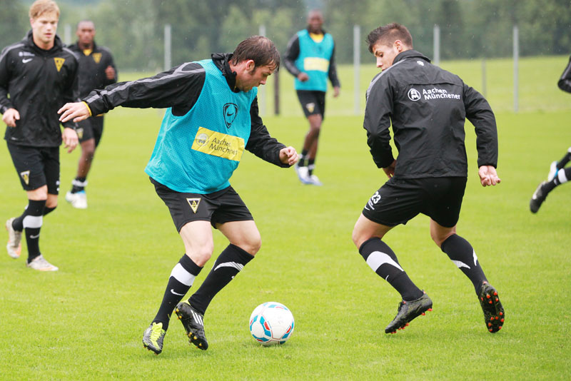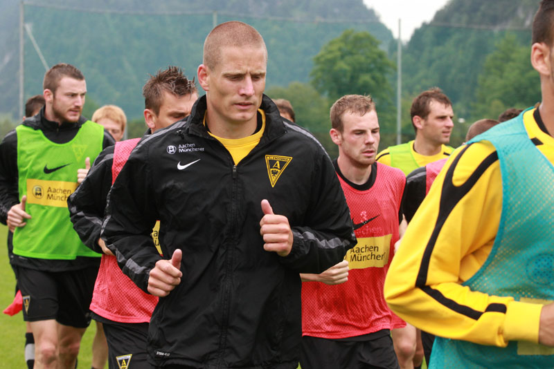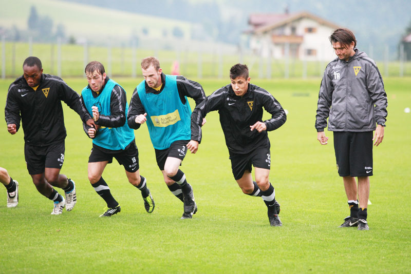 Fußball: Der Trainer legt im Vergleich zum Vorjahr größeres Augenmerk auf die Defensive. Nach einem gelungenen Angriff werden zuerst die Verteidiger kritisiert, ehe die Stürmer gelobt werden. Favorisiert wird derzeit ein 4-3-3, dennoch will Hyballa flexibel bleiben. „Der Spielstil ist wichtiger als das System“, sagt der Coach. Diesen Stil will er im Gegensatz zum Vorjahr nicht verändern. Zwei Niederlagen gab es in den Testspielen, die bewusst gegen Teams der Kategorie „Internationale Klasse“ ausgetragen wurden. Was Alemannia in beiden taktisch und spielerisch ablieferte, konnte sich durchaus sehen lassen. Das fanden auch drei Nachwuchstrainer aus Braunschweig, die eine Woche lang das Training von Peter Hyballa studierten. Jede Einheit wurde protokolliert, jede Übung aufgezeichnet – fleißig, fleißig!