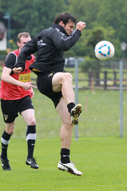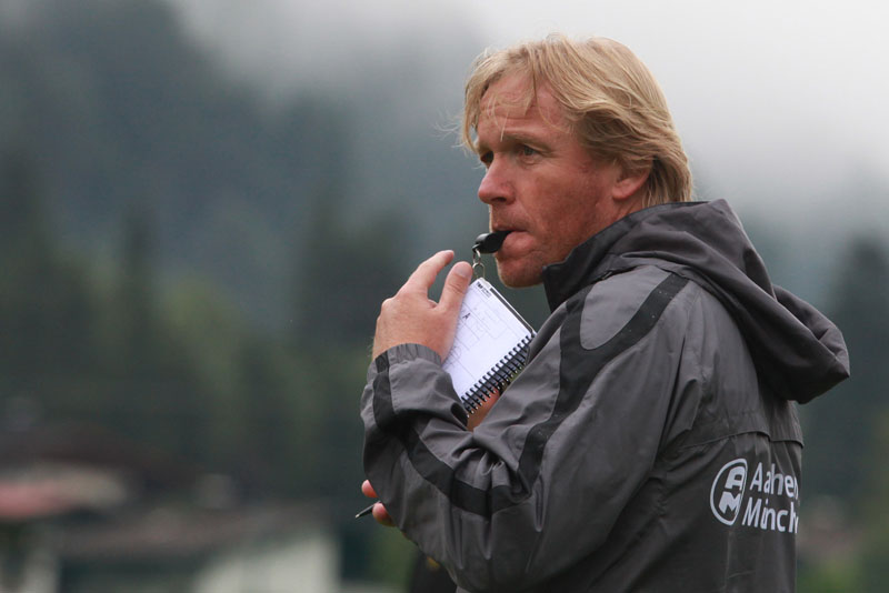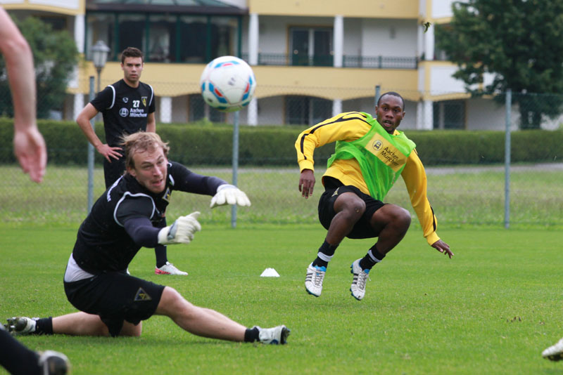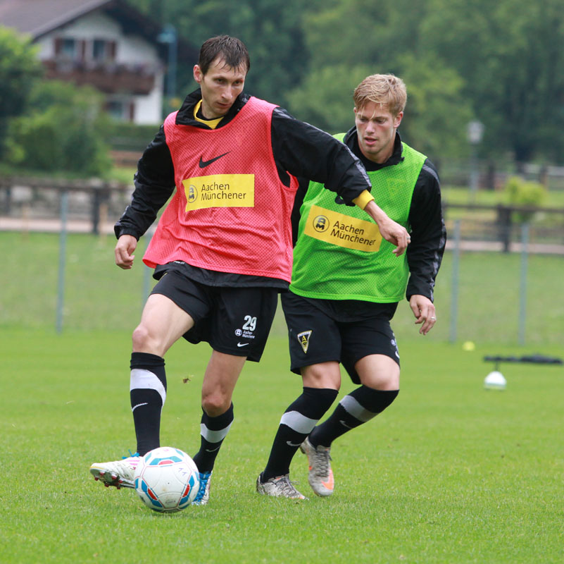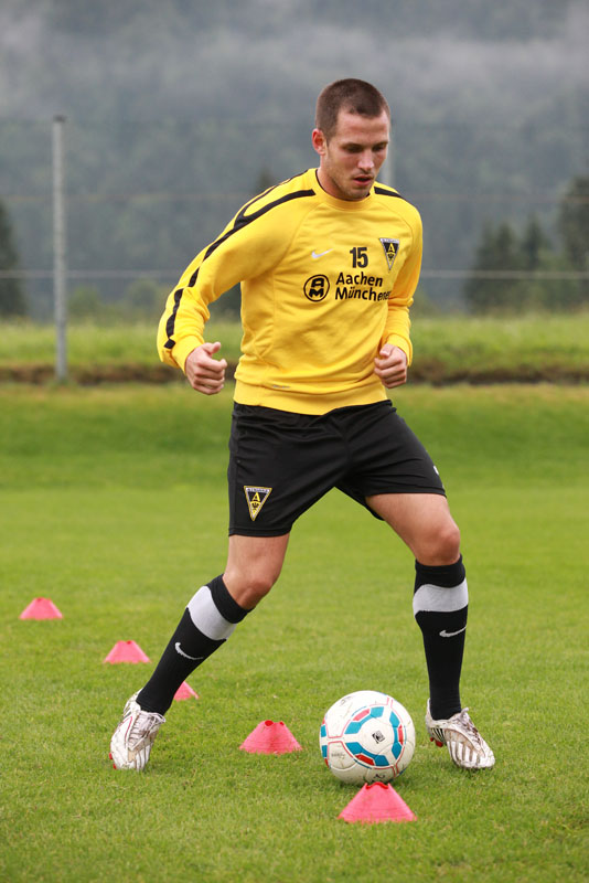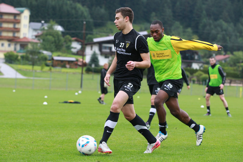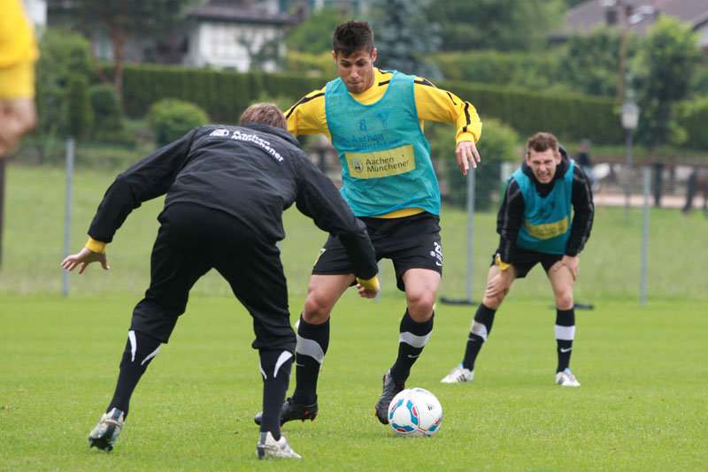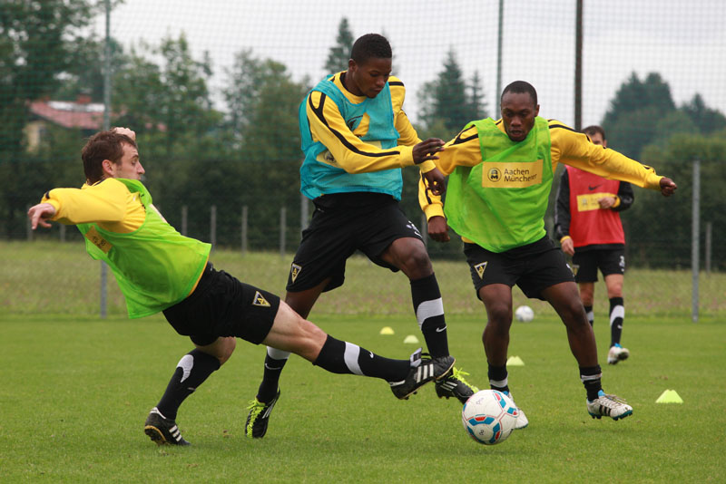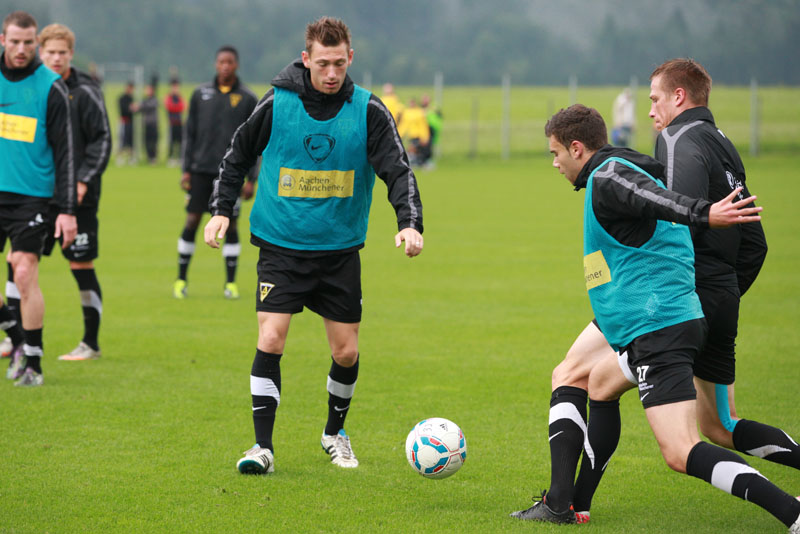Fußball: Der Trainer legt im Vergleich zum Vorjahr größeres Augenmerk auf die Defensive. Nach einem gelungenen Angriff werden zuerst die Verteidiger kritisiert, ehe die Stürmer gelobt werden. Favorisiert wird derzeit ein 4-3-3, dennoch will Hyballa flexibel bleiben. „Der Spielstil ist wichtiger als das System“, sagt der Coach. Diesen Stil will er im Gegensatz zum Vorjahr nicht verändern. Zwei Niederlagen gab es in den Testspielen, die bewusst gegen Teams der Kategorie „Internationale Klasse“ ausgetragen wurden. Was Alemannia in beiden taktisch und spielerisch ablieferte, konnte sich durchaus sehen lassen. Das fanden auch drei Nachwuchstrainer aus Braunschweig, die eine Woche lang das Training von Peter Hyballa studierten. Jede Einheit wurde protokolliert, jede Übung aufgezeichnet – fleißig, fleißig!