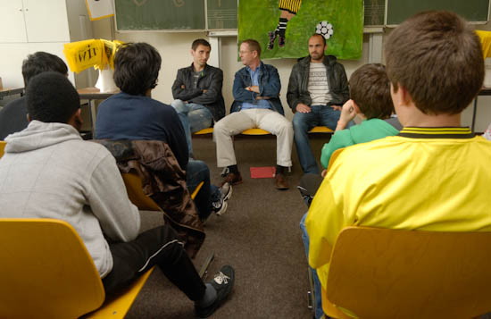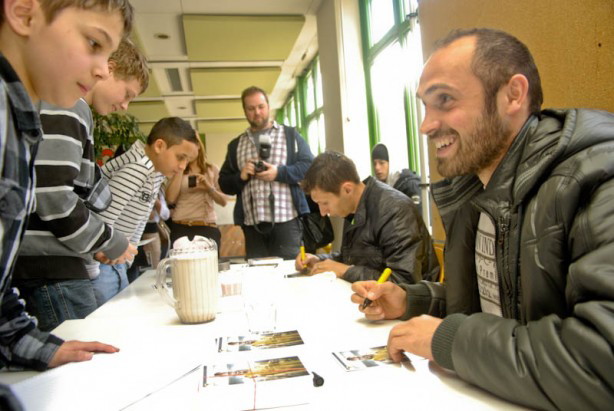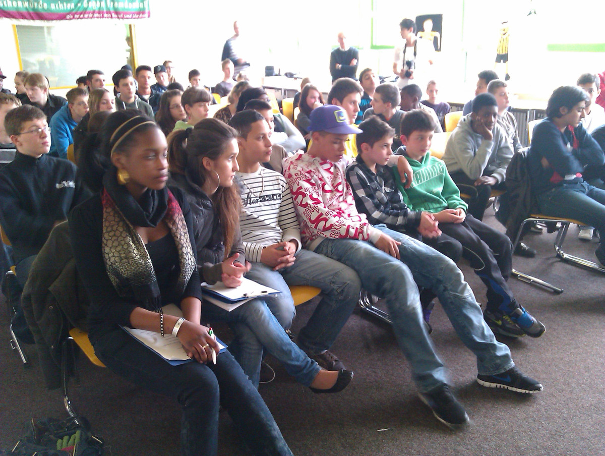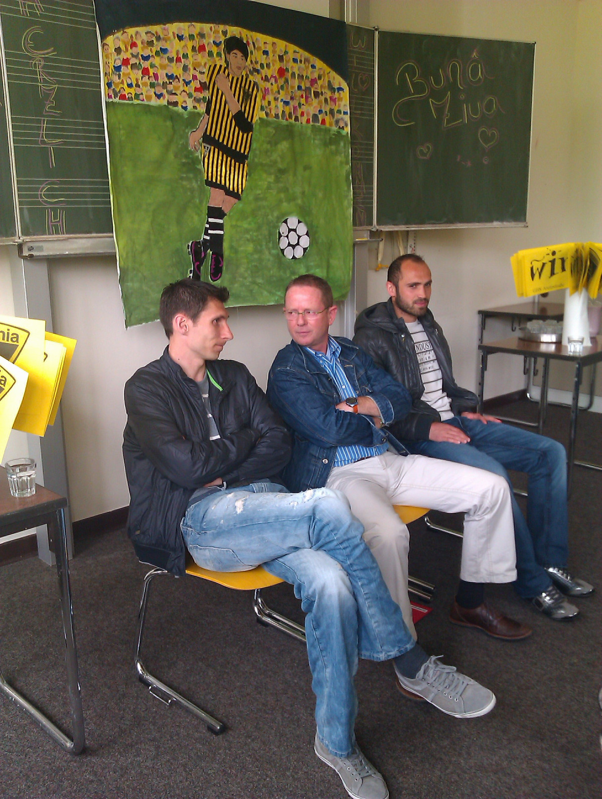 Die Projektwoche der Gemeinschaftshauptschule Aretzstraße stand in diesem Jahr ganz unter dem Motto Schwarz-Gelb. Die Schülerinnen und Schüler von Alemannias Partnerschule erhielten eine Wochen lang Einblicke in den Arbeitsalltag eines Fußballvereins. In diversen Unterrichtseinheiten, für die die Alemannia der Schule Material zur Verfügung stellte, beschäftigten sich die Schüler mit Themen rund um die Alemannia und bereiteten sich dabei unter anderem auf den Besuch der beiden Alemannia-Profis Bilal Cubukcu und Sergiu Radu vor. Die beiden Neuzugänge besuchten die GHS am Mittwoch. Neben der obligatorischen Autogrammstunde beantworteten die beiden die vielen Fragen der Schüler, z.B. wie der Tagesablauf eines Profisportlers aussieht, was man tun muss um sein Hobby zum Beruf zu machen und wie es sich anfühlt, vor vielen Zuschauern zu spielen.