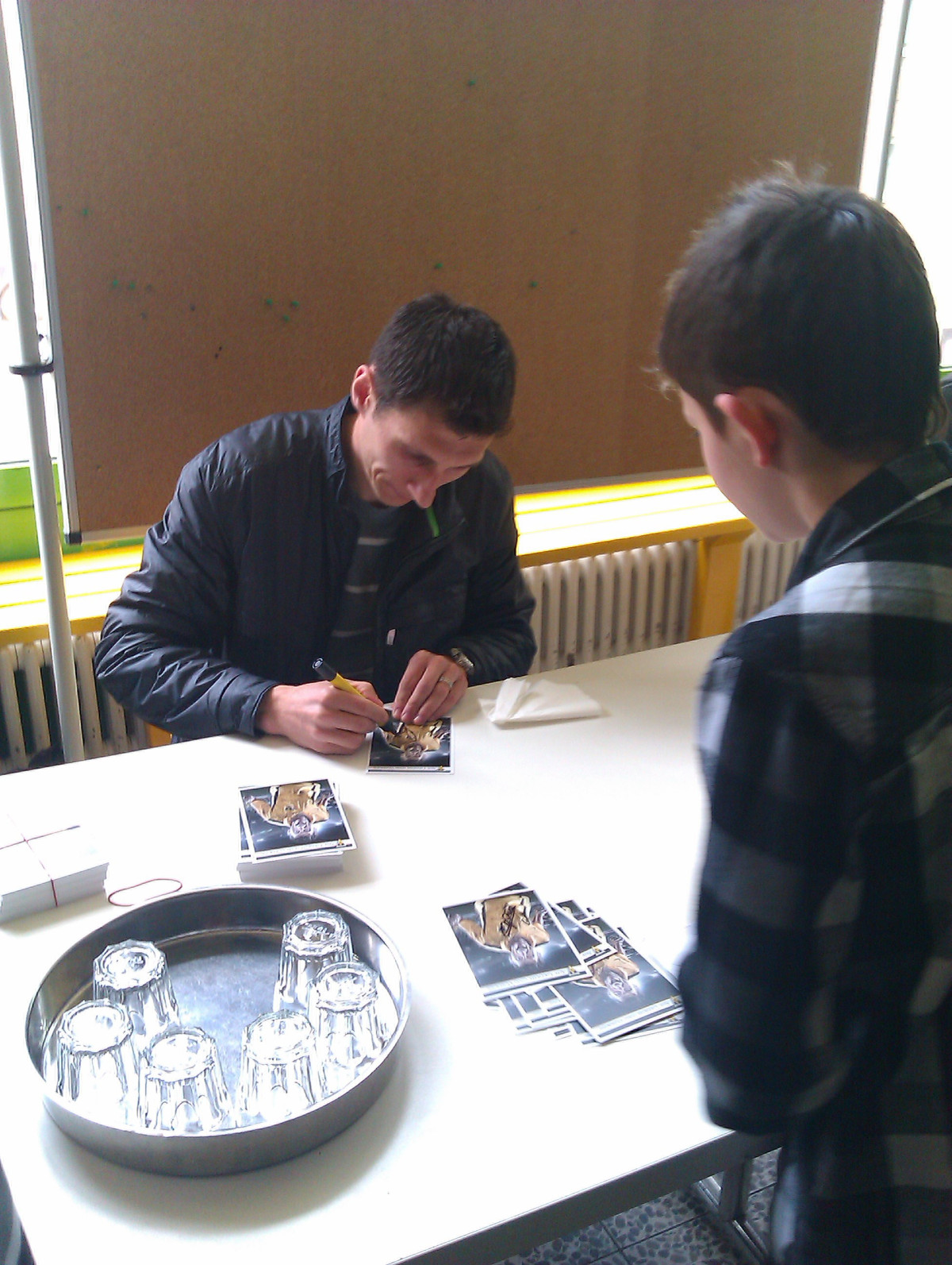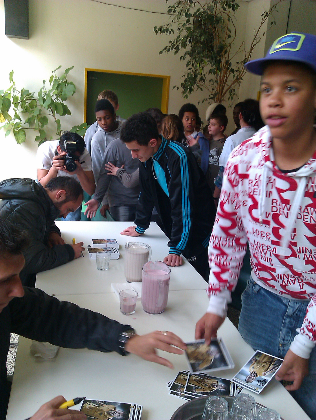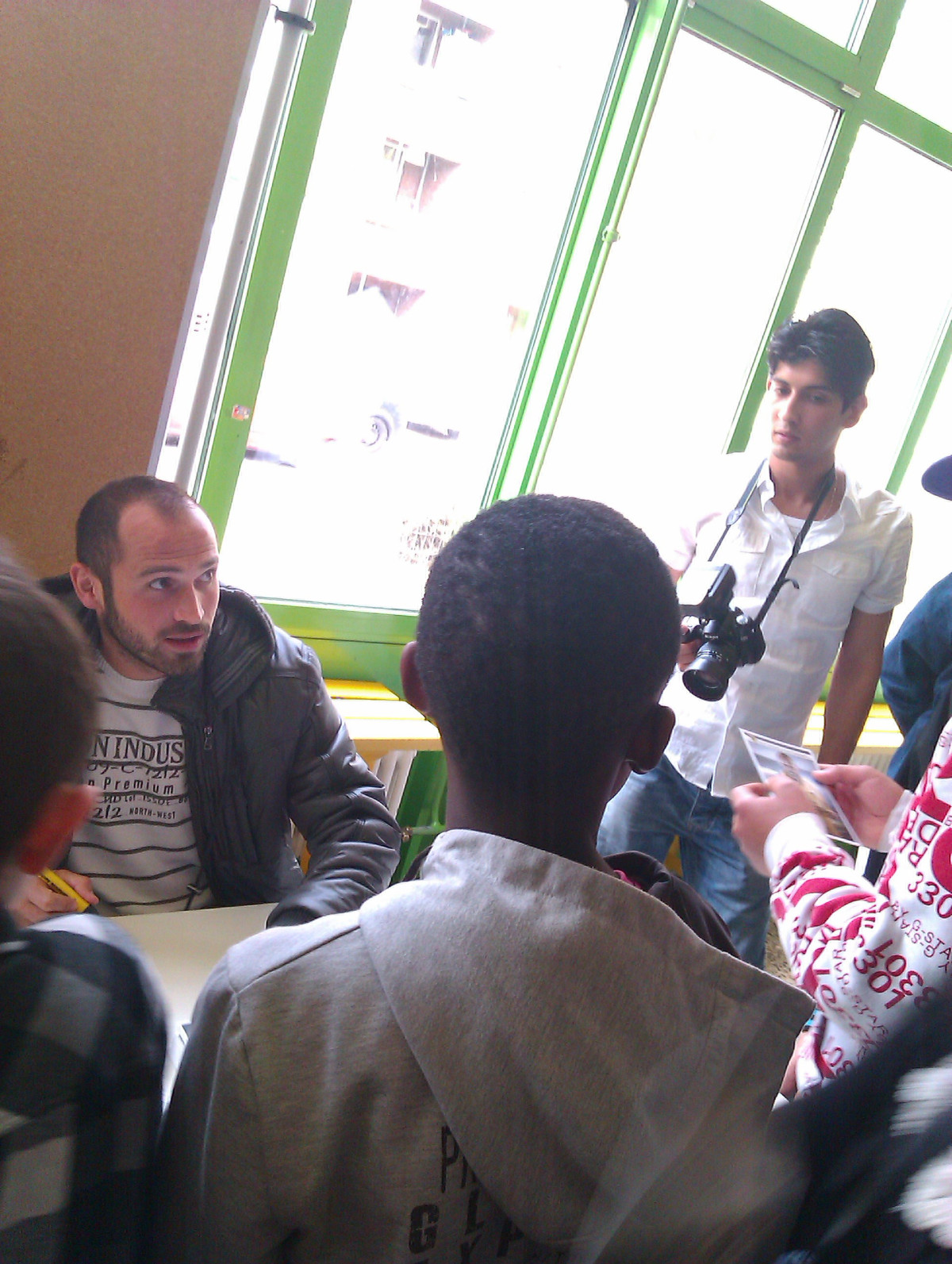 Die Projektwoche der Gemeinschaftshauptschule Aretzstraße stand in diesem Jahr ganz unter dem Motto Schwarz-Gelb. Die Schülerinnen und Schüler von Alemannias Partnerschule erhielten eine Wochen lang Einblicke in den Arbeitsalltag eines Fußballvereins. In diversen Unterrichtseinheiten, für die die Alemannia der Schule Material zur Verfügung stellte, beschäftigten sich die Schüler mit Themen rund um die Alemannia und bereiteten sich dabei unter anderem auf den Besuch der beiden Alemannia-Profis Bilal Cubukcu und Sergiu Radu vor. Die beiden Neuzugänge besuchten die GHS am Mittwoch. Neben der obligatorischen Autogrammstunde beantworteten die beiden die vielen Fragen der Schüler, z.B. wie der Tagesablauf eines Profisportlers aussieht, was man tun muss um sein Hobby zum Beruf zu machen und wie es sich anfühlt, vor vielen Zuschauern zu spielen.