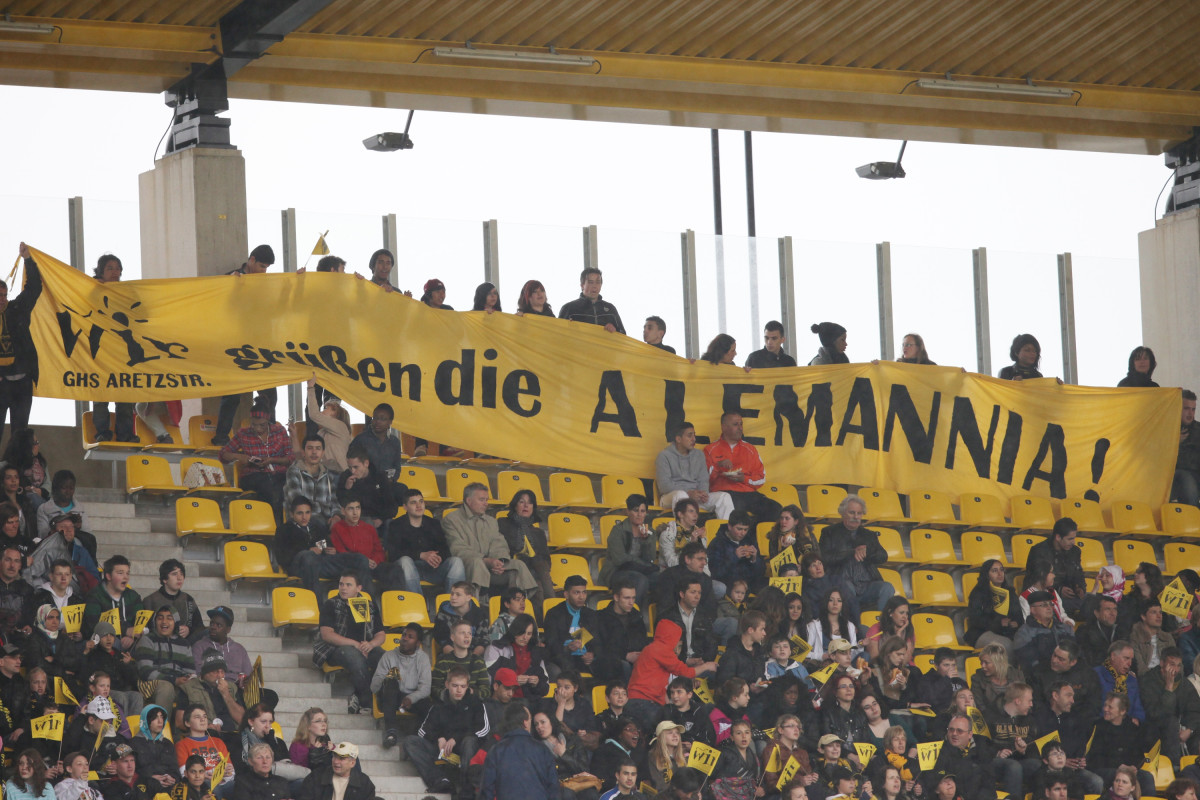 Am Freitag waren die Schülerinnen und Schüler dann zu Gast am Tivoli. Vor dem Training der Profis stand Chef-Trainer Peter Hyballa den Jugendlichen Rede und Antwort und berichtete vom Alltag eines Fußballtrainers. Wie dieser genau aussieht, davon konnten sich die Schüler beim anschließenden Besuch des Trainings ein genaues Bild machen. Aber auch andere Berufsbilder, die in einem Fußballverein benötigt werden, wurden thematisiert. Bei einem Rundgang durch das Stadion und die Büroräume des Tivoli berichteten Angestellte verschiedener Abteilungen über ihre Aufgaben bei den Schwarz-Gelben. Zu guter Letzt mischten sich die jungen Gäste dann als Zuhörer unter die Journalisten bei der Pressekonferenz und konnten sich schon einmal ein Bild von der Strategie des Trainers für das kommende Spiel machen. Denn als Highlight der Projektwoche stand der Besuch des Heimspiels gegen den TSV 1860 München auf dem Programm. Rund 300 Schüler, Eltern und Lehrer waren am Sonntag zum Tivoli gekommen, um das Team zu unterstützen. Mit einem riesigen Spruchband machte die Gruppe auf der Tabak Original Tribüne auf sich aufmerksam und feiert gemeinsam den Sieg der Alemannia gegen die Münchner Löwen – ein gelungener Abschluss einer interessanten Projektwoche.