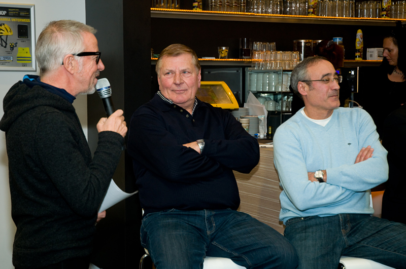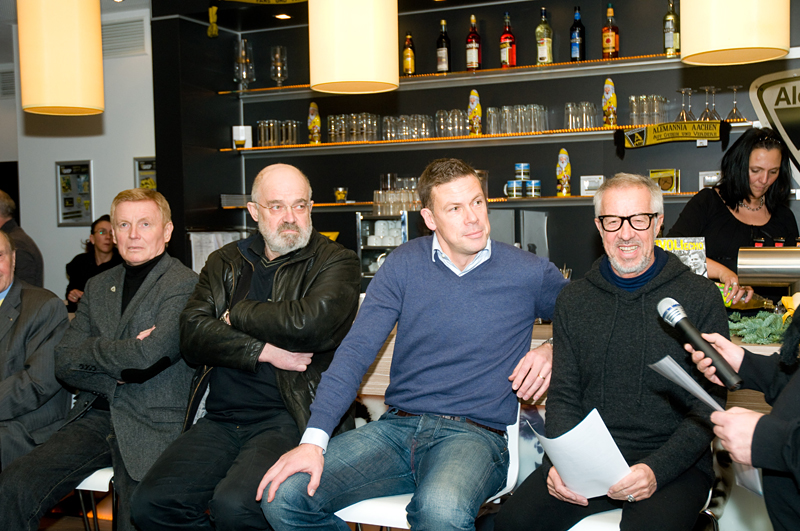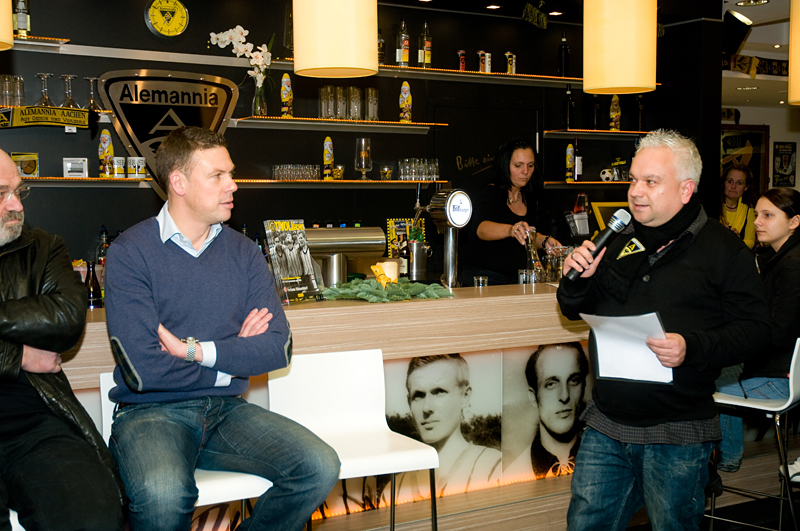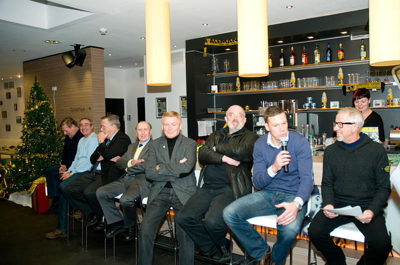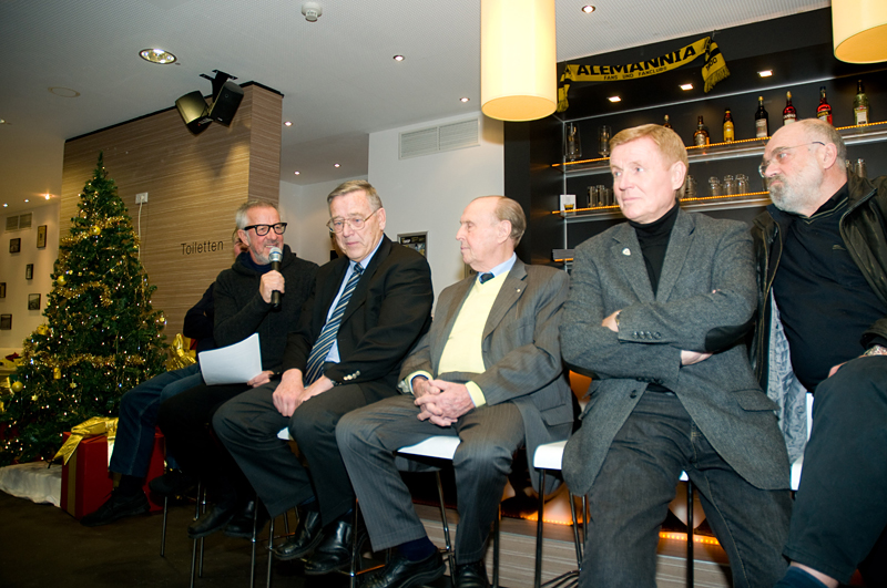 Es war der Abend der guten alten Zeiten. Gerne blickt der schwarz-gelbe Anhänger in diesen Tagen auf die lange und ereignisreiche Vereinsgeschichte der Alemannia zurück. Wie ereignisreich sie wirklich ist, zeigte einmal mehr der gestrige Alemannia Fan-Abend. Anlässlich des 110-jährigen Vereinsjubiläums durften sich die Besucher im Klömpchensklub am Dienstagabend über eine Reihe ganz besonderer Gäste freuen. Vorbei schauten ausnahmsweise nicht – wie üblich – die Profis des aktuellen Kaders, sondern alle noch lebendigen Persönlichkeiten der Alemannia-Jahrhundertelf, die eine Experten-Jury vorab bestimmt hatte. Legenden wie Jo Montanes, Jupp Martinelli oder Gerd Klostermann waren gekommen und standen Moderator Robert Moonen Rede und Antwort.