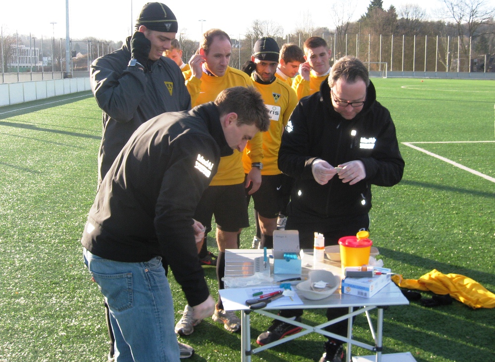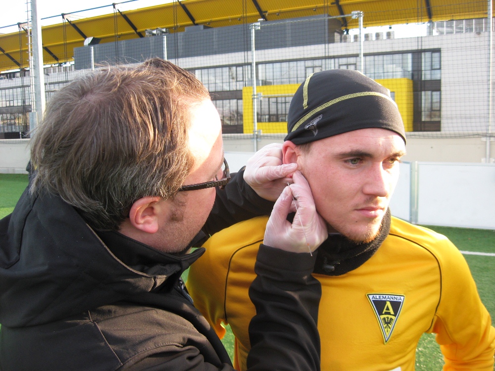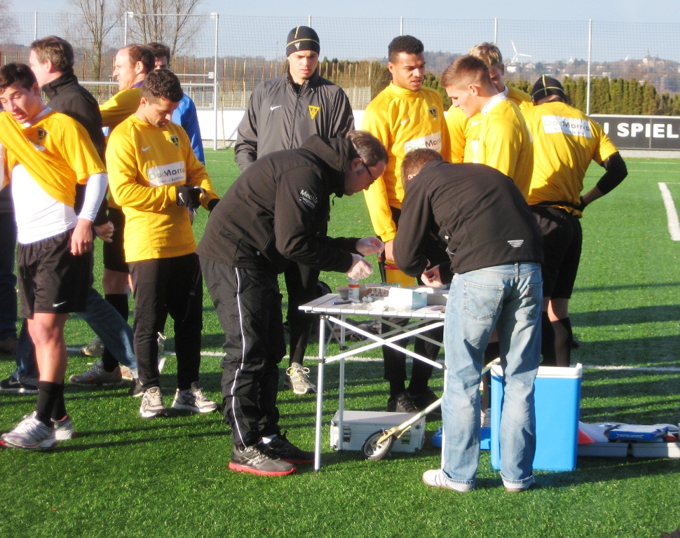 Intensiv begann für Sascha Marquet & Co. die Trainingswoche am Tivoli. Nach den zwei Hallenturnieren am Wochenende bat Coach Peter Schubert am Dienstagmorgen zum Laktattest. In Kooperation mit den Leistungsdiagnostikern vom MediAix Zentrum Aachen führte die Alemannia den Feldstufentest auf den Kunstrasenplätzen auf dem Parkhausdach durch.
