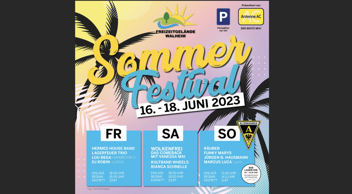Neben dem Alemannia-Sonntag läuft das Festival über drei Tage vom 16. bis zum 18. Juni 2023. U.a. mit dabei: DJ Robin (Leyla), Hermes House Band (I will survive), Lou Bega (Mambo Nr. 5), Wolkenfrei (Das Comeback mit Vanessa Mai), die Wheels und Lagerfeuer Trio.