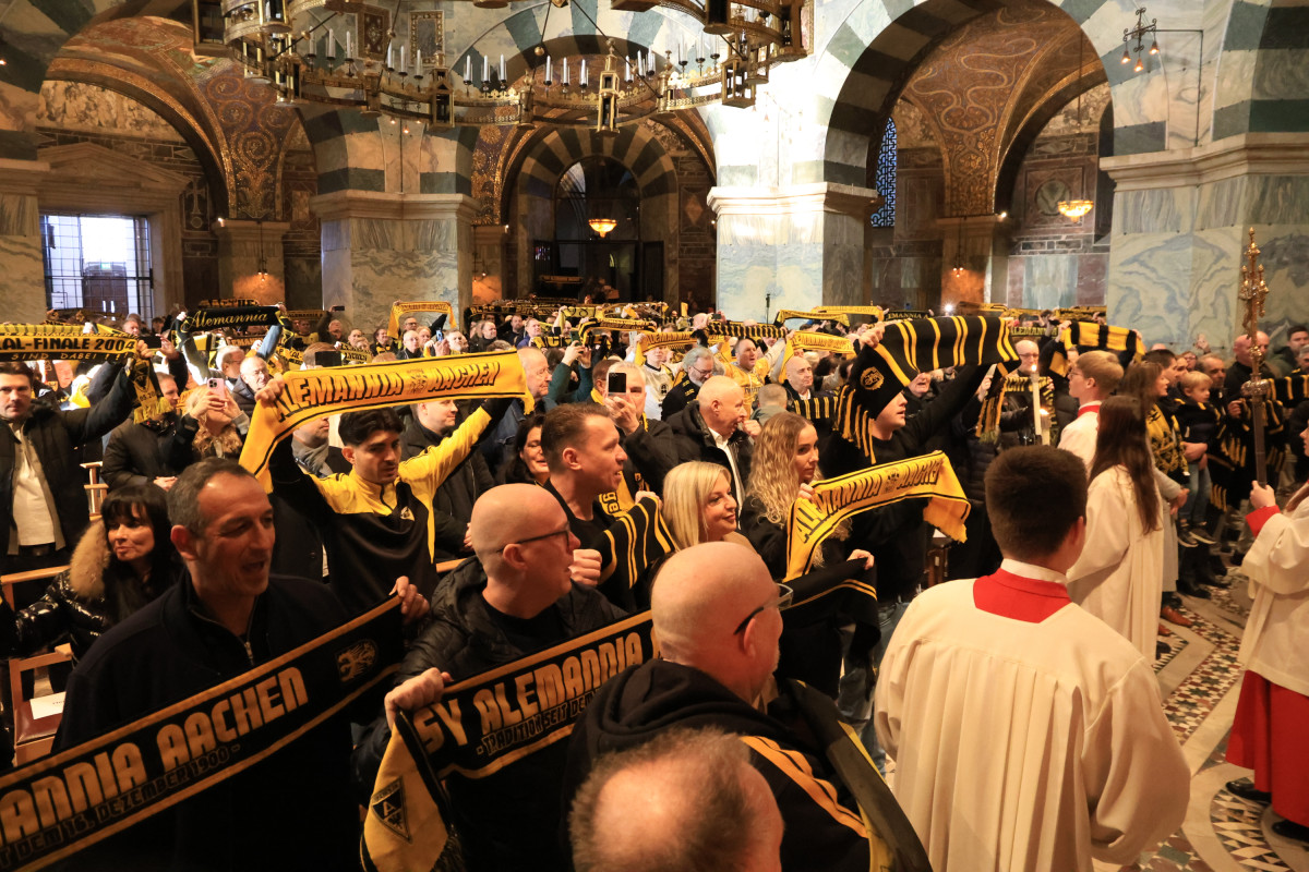 Einen besonders emotionalen Moment schuf Stadionsprecher Robert Moonen. Er bat um eine Schweigeminute für alle Alemannen, die nicht mehr unter uns sind und entzündete im Anschluss eine Alemannia-Kerze im Dom. Diese bleibt im Aachener Dom stehen, bis sie komplett abgebrannt ist.