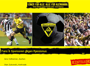 Der Geschäftsführer Bernd Maas: "Diese erste Maßnahme ist Teil einer umfangreichen Kampagne der Alemannia gegen Rassismus. Wir wollen damit schon an diesem Wochenende, obwohl wir ein Auswärtsspiel beim FC Bayern München bestreiten, ein eindeutiges Zeichen setzen und hoffen, dass sich viele Fans mit uns gemeinsam positionieren"