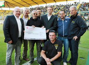 Die Mühe der Alemannia-Historiker um Archivar Lutz van Hasselt hat sich also gelohnt. Im Rahmen des Derby Cups übergab er gemeinsam mit Willi Sieprath, Robert Jacobs und Boris Gillessen aus der Stadionarbeitsgruppe sowie dem Aufsichtsratsvorsitzenden Meino Heyen und Präsident Alfred Nachtsheim einen Scheck über 4.000 Euro. Der Erlös kommt der Hilfsaktion „Menschen helfen Menschen“ der Aachener Zeitung zu Gute.
