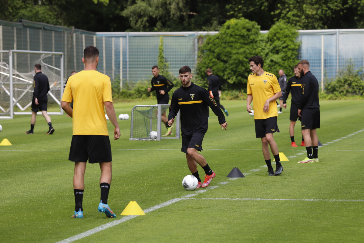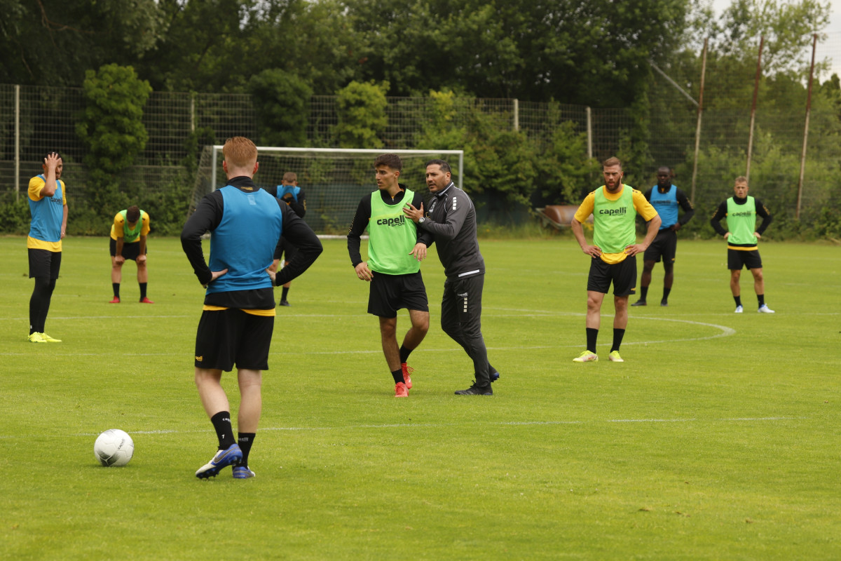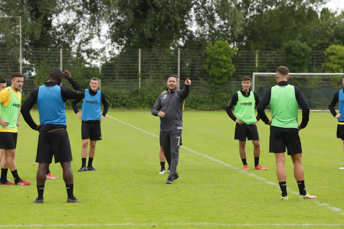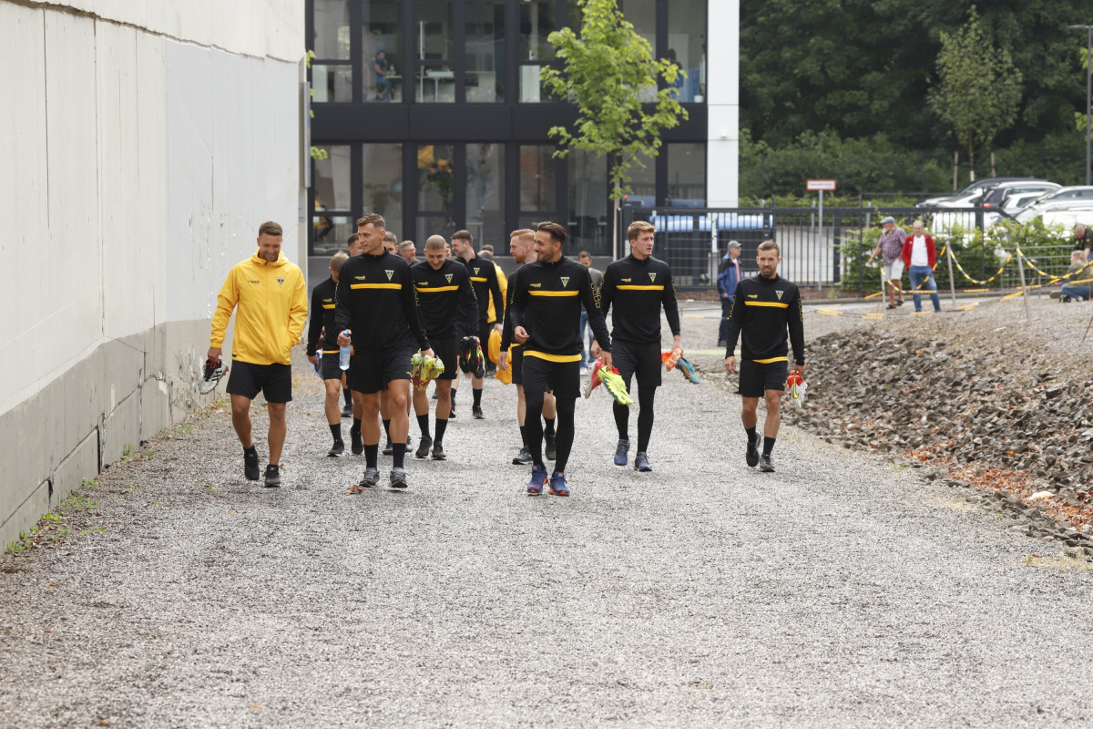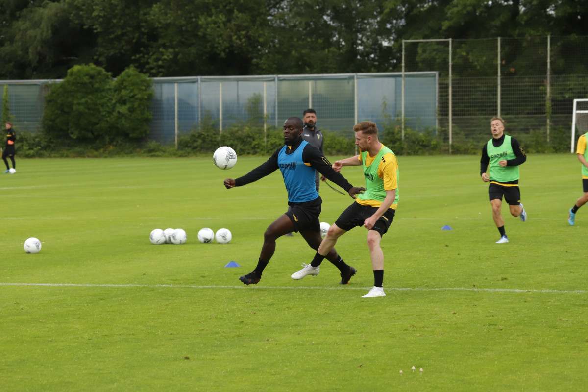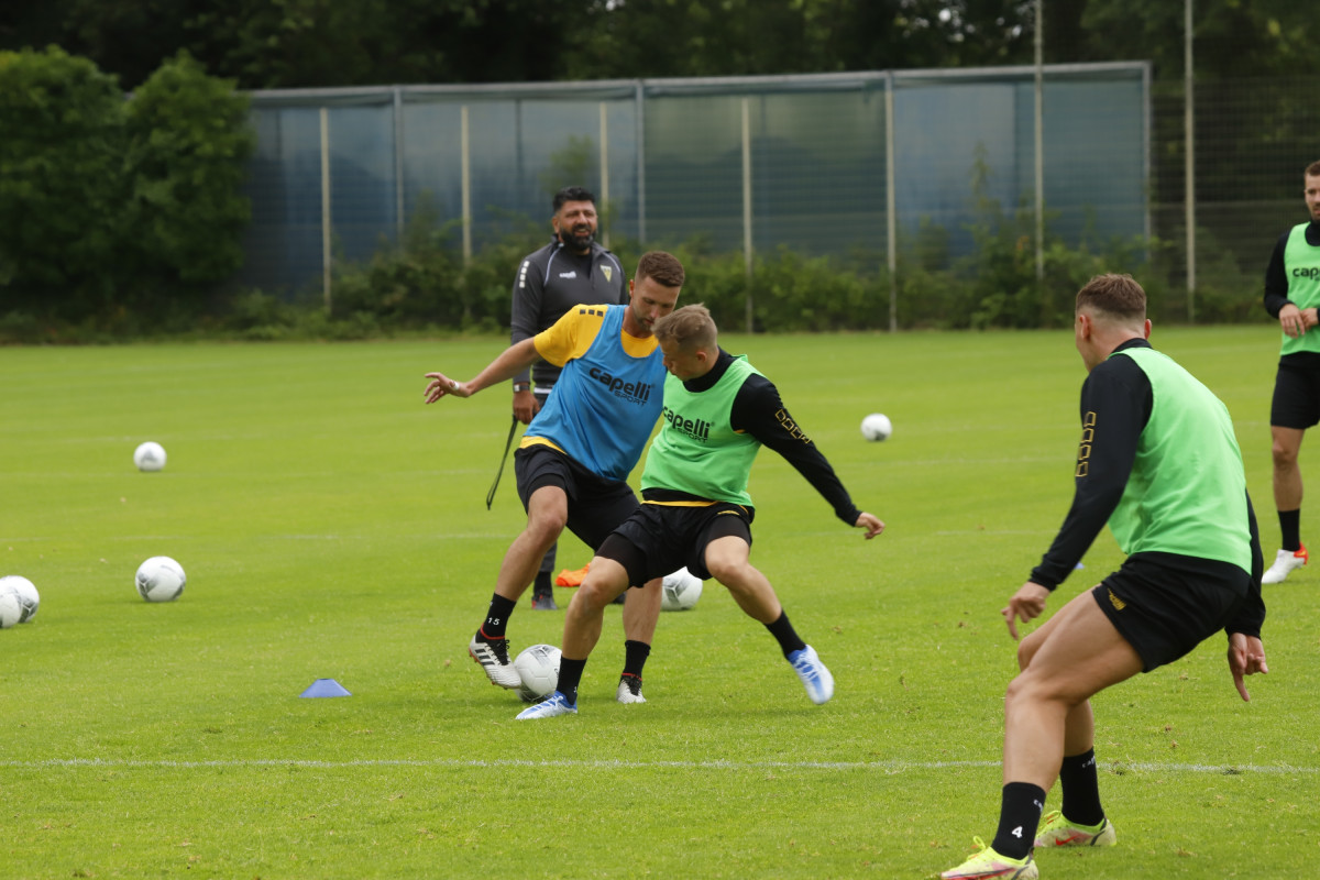 Viele bekannte Gesichter konnten die rund 150 Zaungäste unter den Kilic-Schützlingen ausmachen – neben Jannik Mause, Franko Uzelac, Jannis Held und Co. präsentierten sich dann auch die bis dato fünf extern verpflichteten Neuzugänge zum ersten Mal dem schwarz-gelben Publikum. Wie ihre Teamkollegen zogen Marcel Johnen, Pepijn Schlösser, David Sauerland, Elsamed Ramaj und Exaucé Andzouana bei der ersten Einheit konzentriert mit. Nach rund 90 Minuten voller Koordinations- und Lauftraining sowie Übungen mit Ball hatten es die Akteure auf dem Rasen bereits wieder geschafft – bis es dann am Nachmittag zur zweiten Einheit auf den Platz geht.