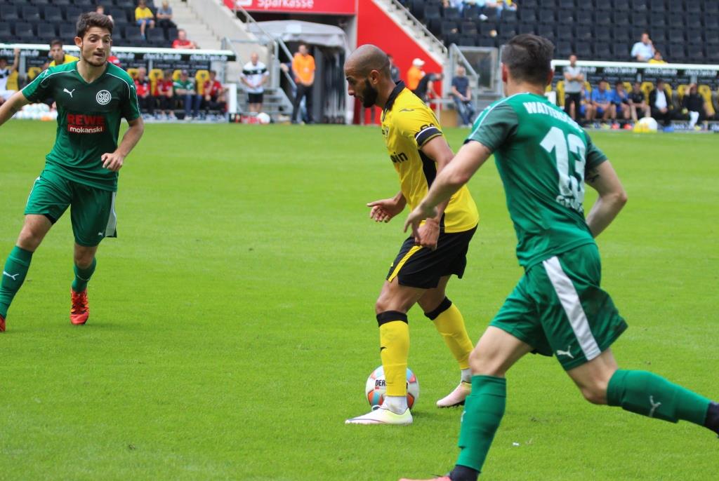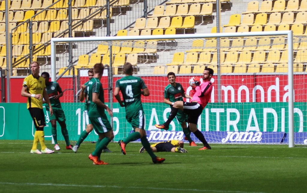 Fuat Kilic musste seine siegreiche Elf aus dem Auftaktspiel auf einer Position verändern. Für den angeschlagenen Dennis Dowidat rückte Tobias Mohr in die Startformation. Der Gast aus Wattenscheid erwischte den besseren Start und nutzte seine erste Gelegenheit nach acht Minuten prompt zur Führung. Die Alemannen bekamen keinen Druck auf den Ball, Canbulut hatte aus 20 Metern freie Schussbahn und versenkte die Kugel flach zum 0:1 ins linke Eck. Auch in der Folgezeit hatten die Tivoli-Kicker Mühe ins Spiel zu finden. Propheter stoppte Buckmaier vor der Strafraumgrenze regelwidrig. Der fällige Freistoß von Glowacz aus 17 Metern blieb zum Glück in der Aachener Mauer hängen. Erst danach fanden die Schwarz-Gelben etwas mehr Zugriff und hatten den Ausgleich auf dem Fuß. Mohammad bediente Rüter, der uneigennützig für Fejzullahu querlegte. Der Torschütze aus dem Siegen-Spiel zögerte vor dem leeren Tor einen Tick zu lange und die Gäste konnten in höchster Not klären (23.). Kurz vor der Pause wurde es turbulent. In einer eigentlich ungefährlich wirkenden Situation griff Ernst im Strafraum an den Arm von Erwig-Drüppel. Schiedsrichter Jolk entschied zum Entsetzen der Schwarz-Gelben auf Strafstoß und verwies den Rechtsverteidiger wegen Notbremse des Feldes. Glowacz lief an, doch Nagel parierte den Elfmeter stark (45.).