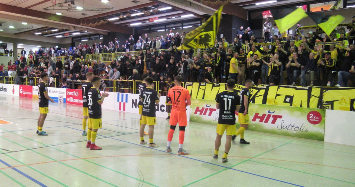 Gegen den Ligakonkurrenten aus Düren reichte ein Unentschieden, da die Dürener zuvor mit 6:3 gegen Ay-Yildizspor gewonnen hatten. In einem hitzigen Spiel brachte Salman Düren in Führung, bevor die Alemannia nach Reklamieren von Lukas Wilton zwei Minuten in Unterzahl überstehen musste. Nach der Pause glich Ramaj aus, aber Harnafi brachte Düren eine Minute später erneut in Führung. Sechs Minuten vor Schluss wurde Imbongo freigespielt und traf zum letztlich entscheidenden 2:2, das die Alemannia über die Zeit brachte.