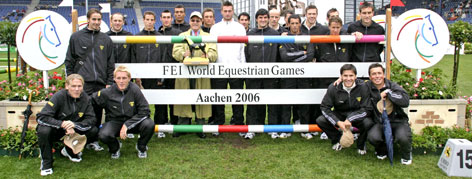 Nach dem Vormittagstraining lief das Team kurzerhand die wenigen Meter hinüber zum CHIO. Die Fußballer staunten nicht schlecht, wie groß so ein Parcours ist - und wie hoch die Hindernisse. Genau in der Mitte des riesigen Springstadions wurde der gesamte Kader von Moderator Manfred Kutsch zum Stadion-Interview gebeten. Im Gepäck hatten die Kicker nicht nur unzählige Alemannia-Kappen, die ans Publikum verteilt wurden - was sich beim Aachener Nieselregen als sinnvolles Mitbringsel erwies. Kapitän Erik Meijer übergab ALRV-Präsident Klaus Pavel auch ein Miniaturpferd, das der Aachener Künstler Detlef Kellermann extra im schwarz-gelben Design gestaltet hatte. "Sport bleibt Sport. Wir bei der Alemannia sind sehr froh, dass 2006 gleich neben dem Tivoli die Weltreiterspiele stattfinden. Deshalb bekommt in dieser Saison jede Gastmannschaft ein solches Pferd", erklärte Meijer die Aktion mit den Minipferden.