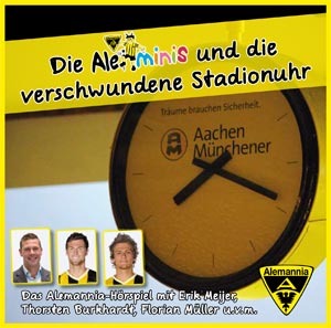 Im wahren Leben hat die alte Stadionuhr der Alemannia ihren Platz im neuen Tivoli bereits gefunden. Doch was passiert, wenn die Uhr auf dem Weg in die neue Heimat der Alemannia verschwindet? Dieser Herausforderung stellen sich die beiden Aleminis Leon und Sophie im Kinder-Hörspiel der Alemannia. Zusammen mit Erik Meijer machen sich die beiden auf die spannende Suche nach der Stadionuhr, die der Mannschaft auch im neuen Stadion Glück bringen soll. Hilfe erhalten sie dabei unter anderem von Thorsten Burkhardt, Florian, Müller, Leo Führen und Jürgen Linden, die allesamt an dem Hörspiel mitgewirkt haben.