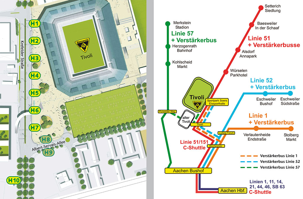 Bei den Heimspielen bietet die ASEAG zusätzlich zum gewohnten Linienverkehr Sonderverkehre auf den Hauptlinien im Stadt- und Kreisgebiet Aachen an. Nach Umgestaltung der Krefelder Straße und der Schaffung einer zusätzlichen Busspur werden am Sportpark Soers fortan acht Haltestellen an der Krefelder Straße und zwei weitere an der Albert-Servais-Allee von den ASEAG-Bussen angefahren. 40 Gelenkbusse sind im Einsatz, damit Fans sicher und bequem zum Tivoli und wieder nach Hause gelangen. Durch das erweiterte dichte Bus-Shuttle-Netz gelangen Tivoli-Besucher nun aus fast jeder Richtung ohne Umsteigen zum Stadion. Für Inhaber gültiger Eintrittskarten sind Hin- und Rückfahrt mit Bus und auch Bahn (2. Klasse) im Aachener Verkehrsverbund (AVV) am Tag des Spiels kostenlos.