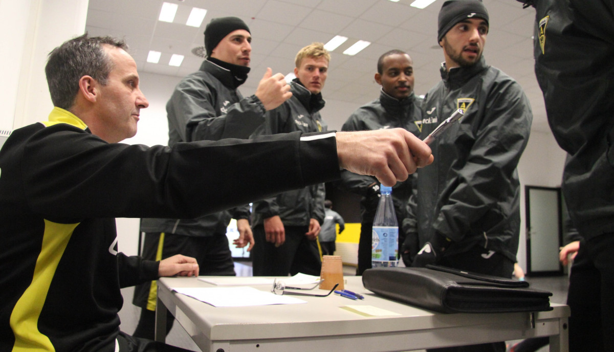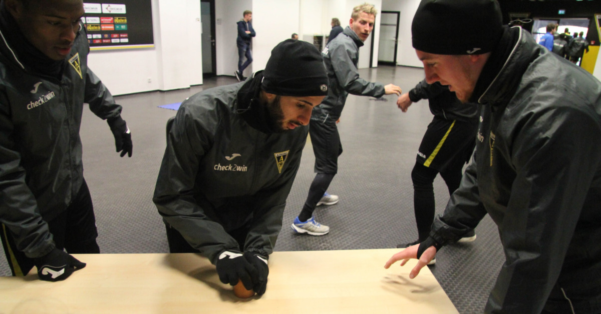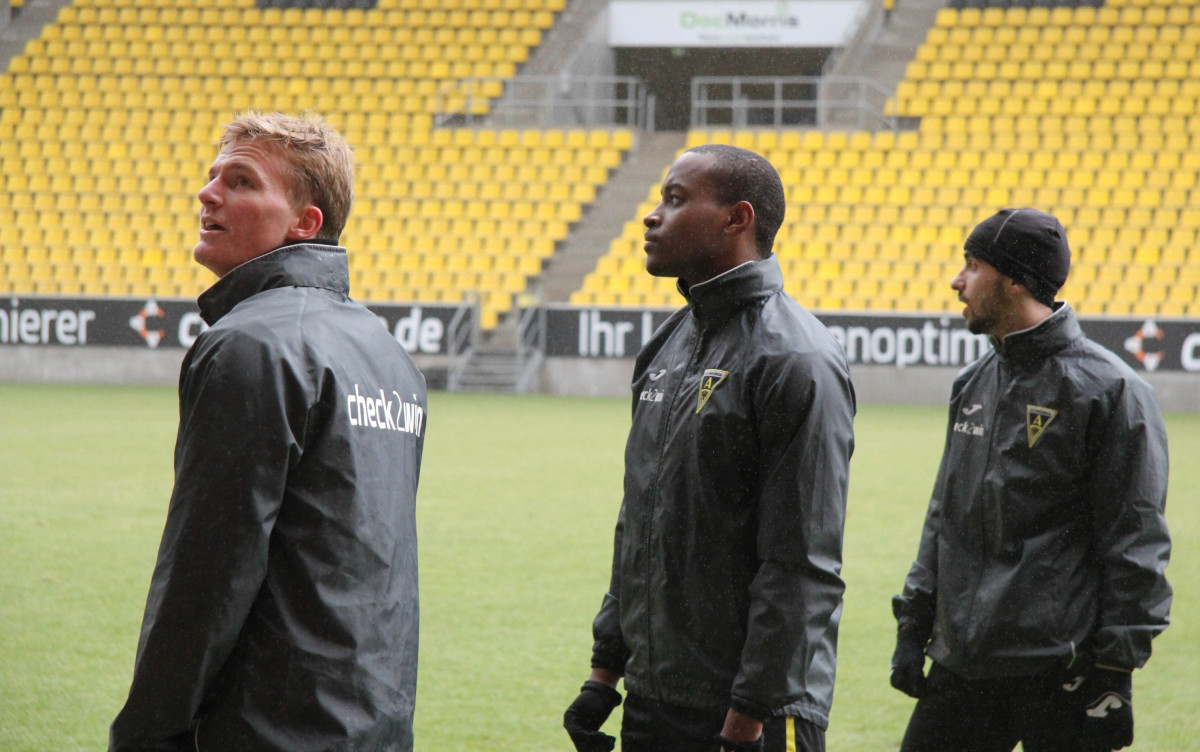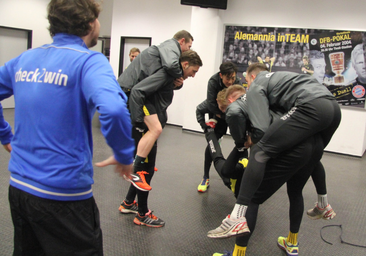 Beim „100-Fragen-Spiel“ kamen die Schwarz-Gelben am dritten Trainingstag der Wintervorbereitung auch ohne Ball ordentlich ins Schwitzen. Im gesamten Stadion hingen die nummerierten Fragen aus, die in Kleingruppen gewürfelt wurden. Die Gruppen mussten dann zunächst die Frage finden, bevor bei den Betreuern die Antwort abgegeben werden konnte. Wurde die Frage nicht korrekt beantwortet, gab es eine Sonderaufgabe zu lösen, bei der Geschick und Teamplay gefordert waren. Für jede falsche Antwort ging es zudem auf eine „Strafrunde“.