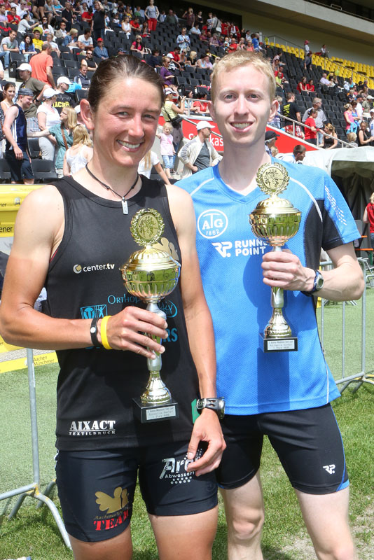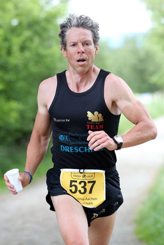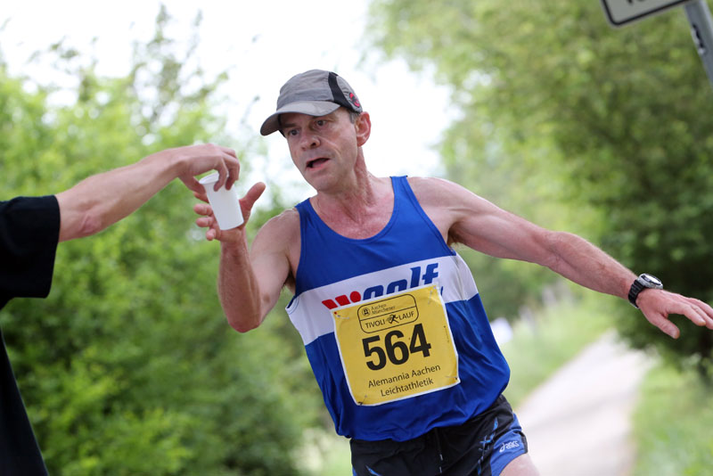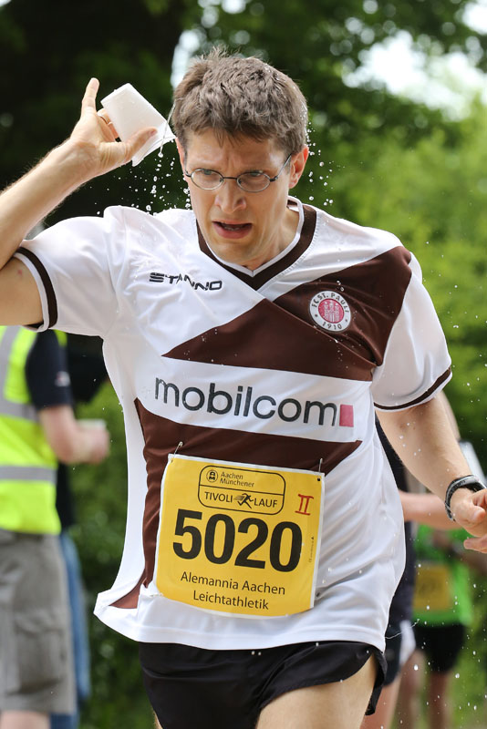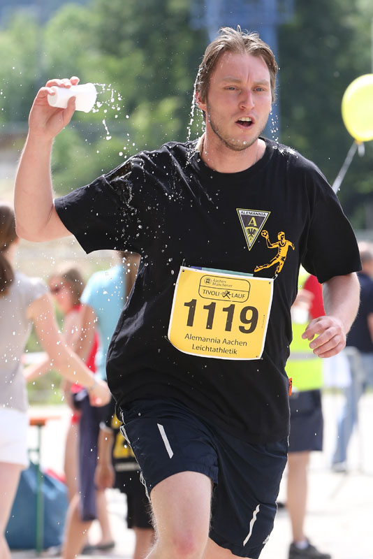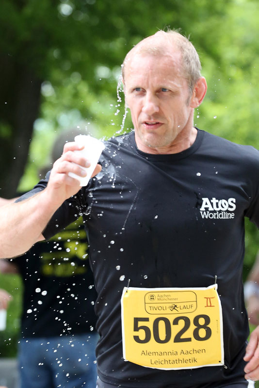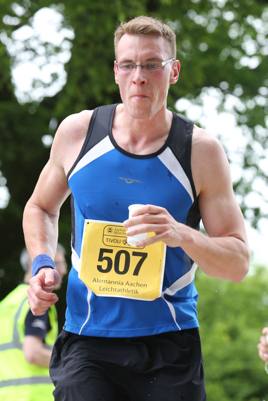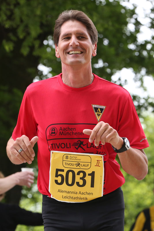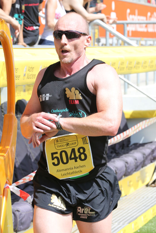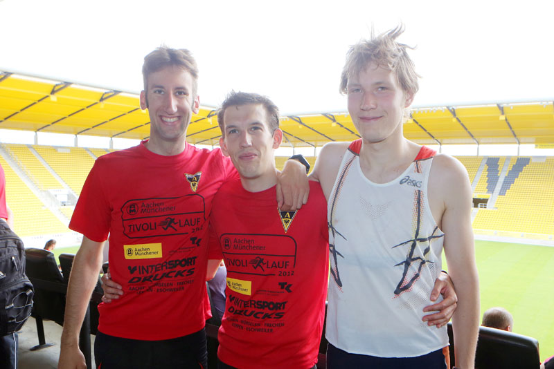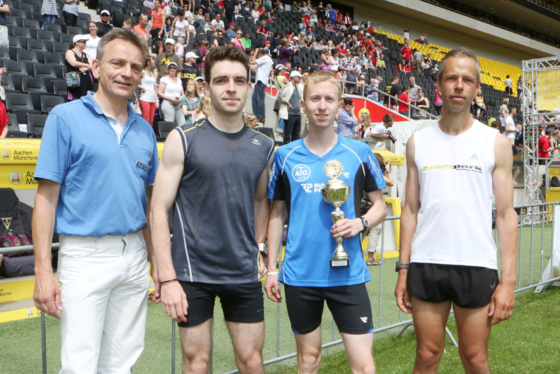Während die Zuschauer auf der Haupttribüne am Tivoli die Sonnenstrahlen sichtlich genossen, war es dem ein oder anderen Läufer verständlicherweise schon ein paar Grad zu warm. Parallel zur immer größer werdenden Anstrengung auf der hügelreichen Strecke kletterte das Thermometer am Vormittag immer weiter nach oben. „Es war sehr kräfteraubend bei dem Wetter, aber es hat Spaß gemacht“, meinte Stefan Schnorr. Der Mann von der Aachener Turngemeinde (ATG) hatte am Ende auch allen Grund zufrieden zu sein, schließlich war er mit einer Zeit von 1:14:54 Stunden vor Asad Zaki und Oscar Garcia Morchon der schnellste Läufer – und das gleich bei seiner ersten Teilnahme am Tivoli-Lauf. Damit stand auch fest, dass Philipp Nawrocki, Doppelsieger der letzten beiden Auflagen, nicht zum dritten Mal aufs Siegertreppchen steigen durfte – zumindest nicht als Einzelläufer. Denn zusammen mit André Collet und Marius Peters ging Nawrocki in der Staffel ins Rennen, mit einer Zeit von 1:13:43 waren die drei Langstreckenläufer der ATG auf Platz eins.