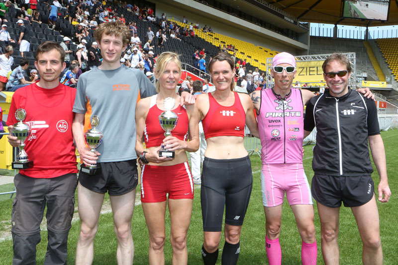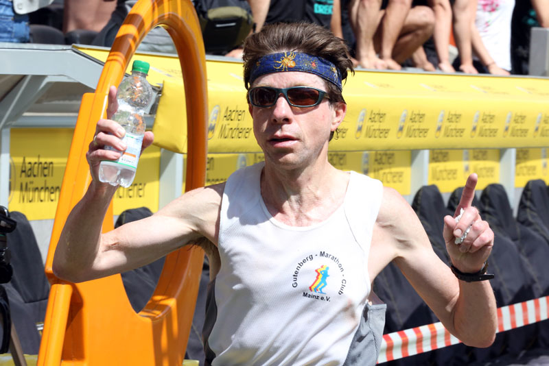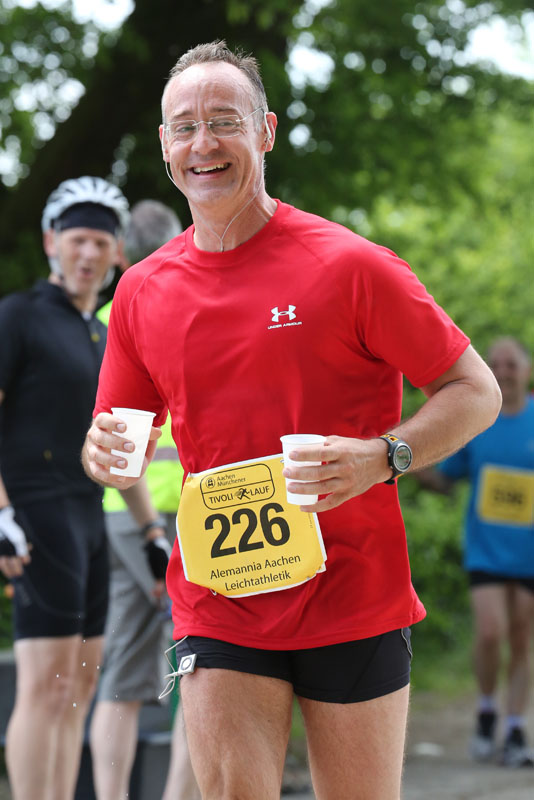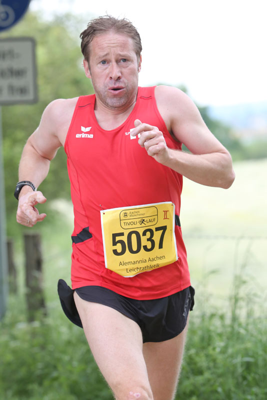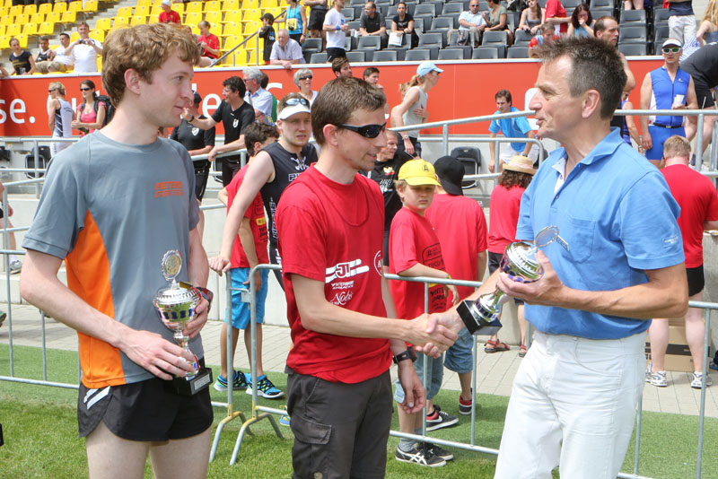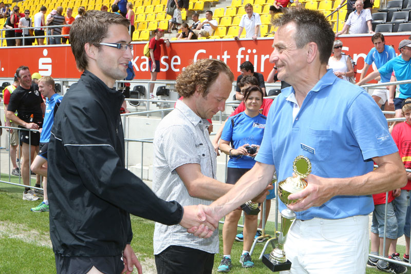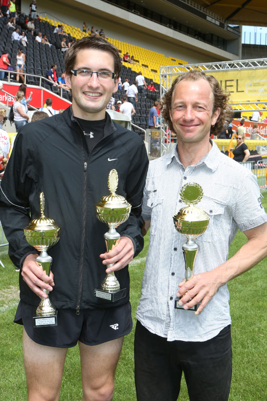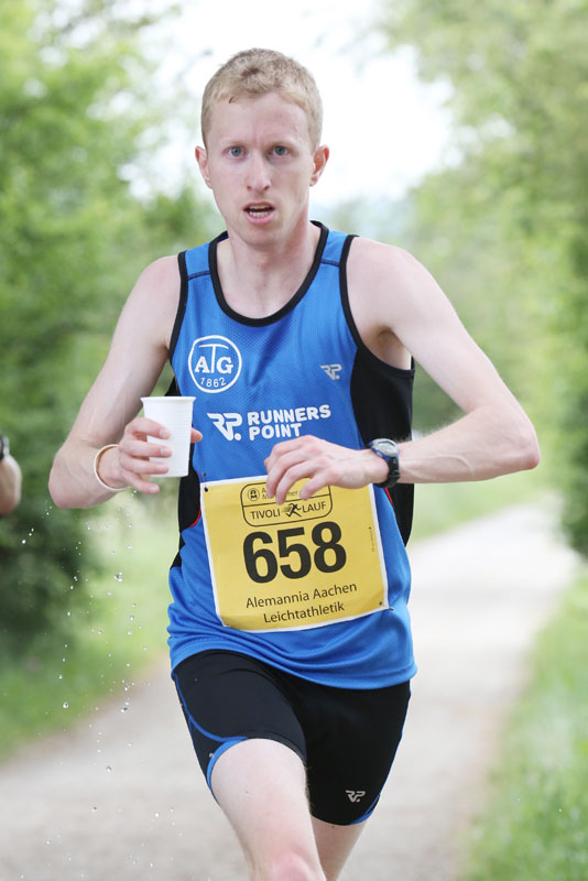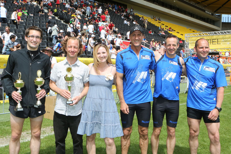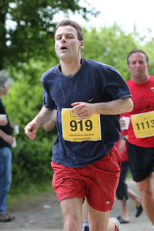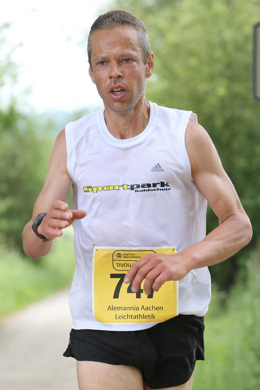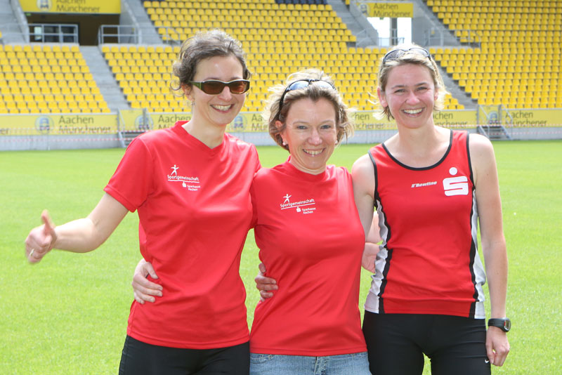 Während die Zuschauer auf der Haupttribüne am Tivoli die Sonnenstrahlen sichtlich genossen, war es dem ein oder anderen Läufer verständlicherweise schon ein paar Grad zu warm. Parallel zur immer größer werdenden Anstrengung auf der hügelreichen Strecke kletterte das Thermometer am Vormittag immer weiter nach oben. „Es war sehr kräfteraubend bei dem Wetter, aber es hat Spaß gemacht“, meinte Stefan Schnorr. Der Mann von der Aachener Turngemeinde (ATG) hatte am Ende auch allen Grund zufrieden zu sein, schließlich war er mit einer Zeit von 1:14:54 Stunden vor Asad Zaki und Oscar Garcia Morchon der schnellste Läufer – und das gleich bei seiner ersten Teilnahme am Tivoli-Lauf. Damit stand auch fest, dass Philipp Nawrocki, Doppelsieger der letzten beiden Auflagen, nicht zum dritten Mal aufs Siegertreppchen steigen durfte – zumindest nicht als Einzelläufer. Denn zusammen mit André Collet und Marius Peters ging Nawrocki in der Staffel ins Rennen, mit einer Zeit von 1:13:43 waren die drei Langstreckenläufer der ATG auf Platz eins.
