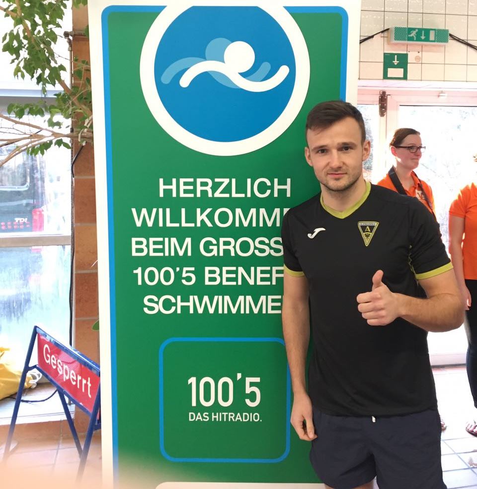 Auch Alemannias Mittelfeldspieler Kai Bösing zog einige Bahnen in der Aachener Ulla-Klinger-Halle. „Es ist eine tolle Sache für den guten Zweck Sport zu treiben“, sagte Bösing im Interview. „Das Seepferdchen sollte reichen, um hier mitzumachen“, fügte er mit einem Grinsen hinzu. Die Alemannia ging bereits in den vergangenen Jahren regelmäßig beim 100‘5 DAS HITRADIO. Benefizschwimmen an den Start.