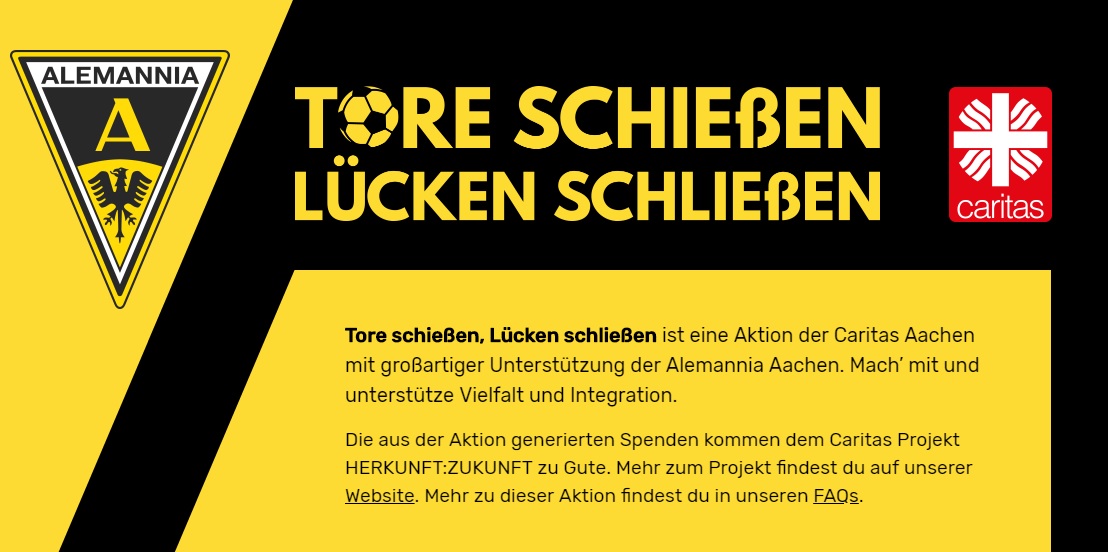 Alemannia Aachen startet zur Saison 2018/ 2019 eine besondere Aktion mit der Caritas Aachen. Jedes Tor, das die Alemannia in der Spielzeit schießt, kommt den Migranten und Flüchtlingen in der Region zugute. Denn jeder Fan ist dazu aufgerufen pro schwarz-gelbes Tor einen frei wählbaren Betrag zu spenden.