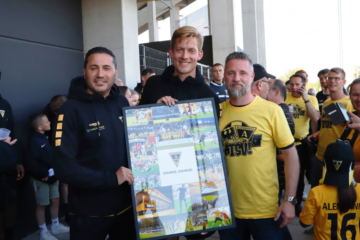 Doch egal, ob vor 30.313 Fans gegen Rot-Weiss Essen oder bei unheimlicher Stille in den Geisterspielen, egal, ob im Auf- und Abstiegskampf oder im gesicherten Mittelfeld, egal, bei welchem Spielstand: Du hast immer alles gegeben, hast dich stets dem Verein untergeordnet. Du hast dein Herz für die Alemannia auf dem Platz gelassen, bist vorangegangen, hast das Team geführt. Du hast mannschaftliche und auch persönliche Rückschläge mit dem nötigen Optimismus und Realismus eingeordnet, hast nach vorne geschaut, hast andere mitgerissen. Du warst ein Anker für jüngere Spieler, warst aber auch selbst immer bereit, dazuzulernen. Deine zu jeder Zeit aufrichtige, ehrliche und offene Art werden wir alle – ob Staff, ob Mannschaft, ob Fans – sehr vermissen.