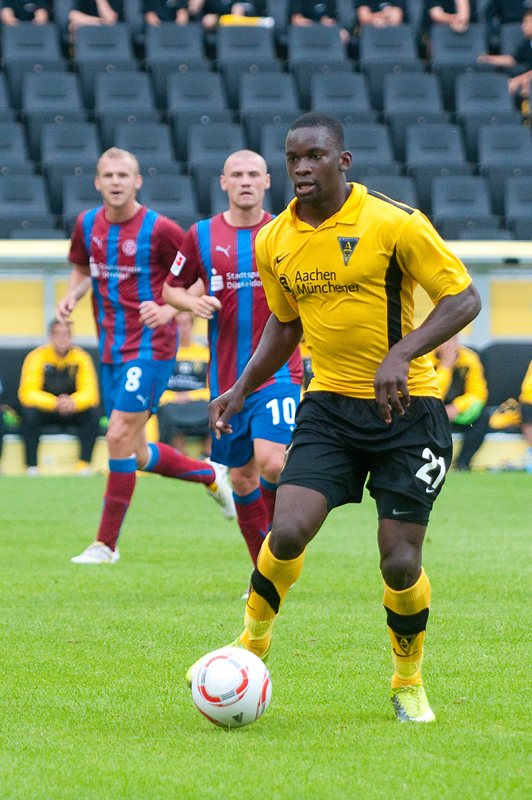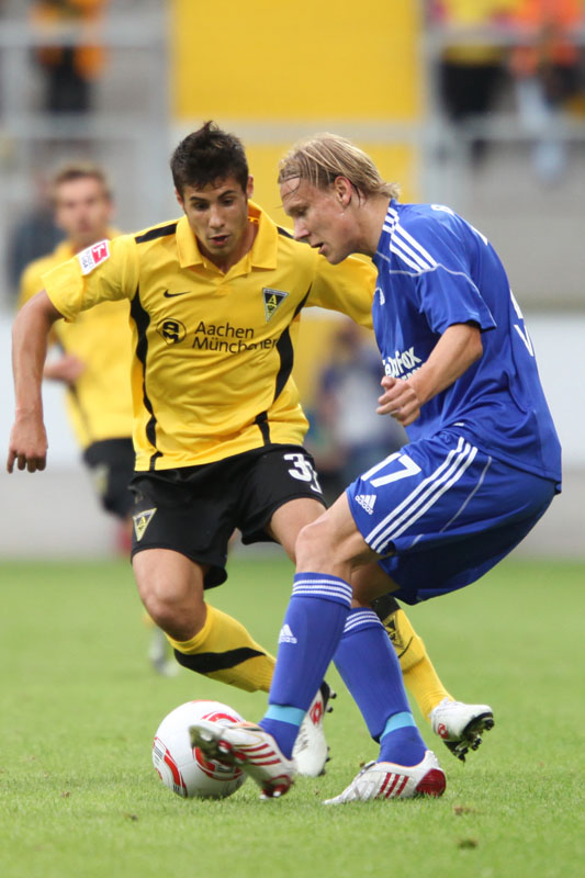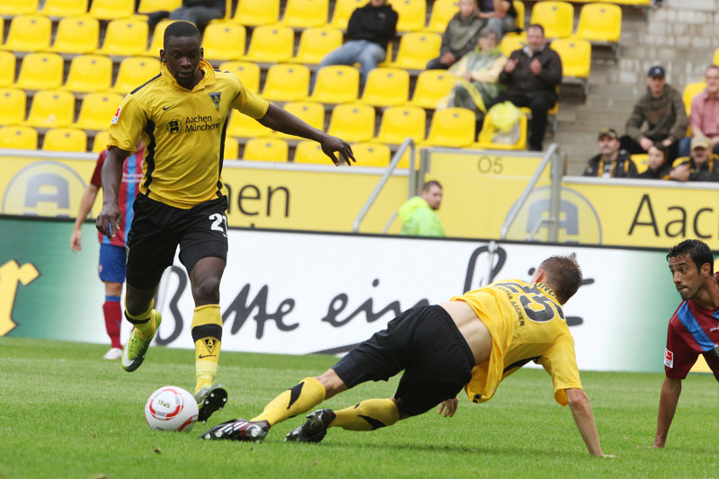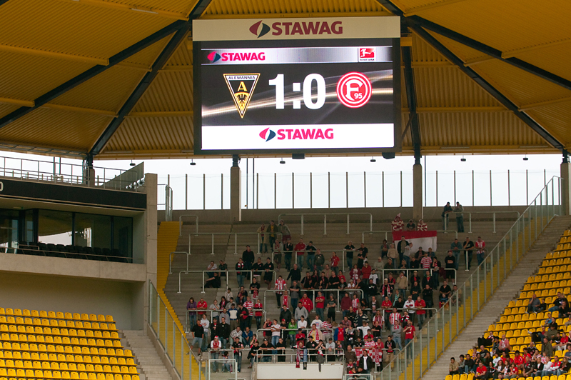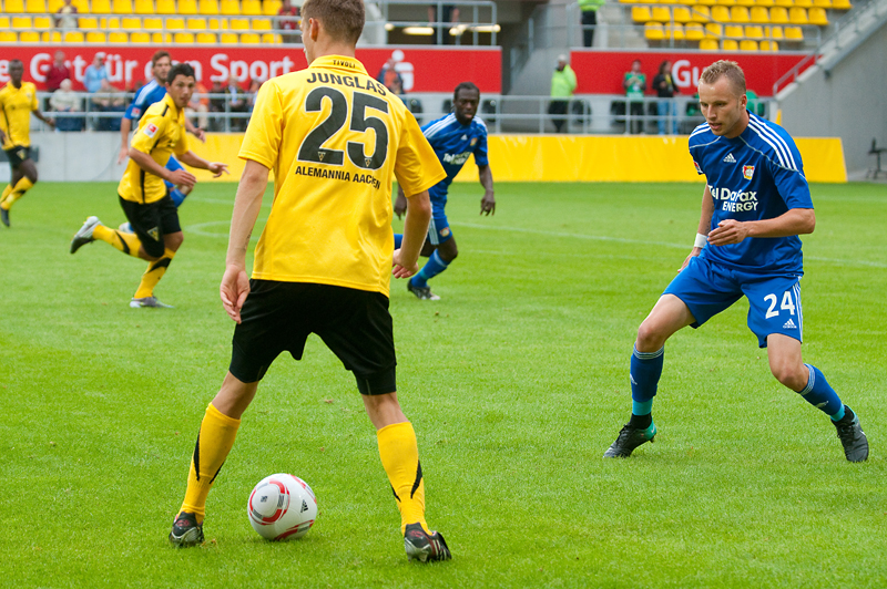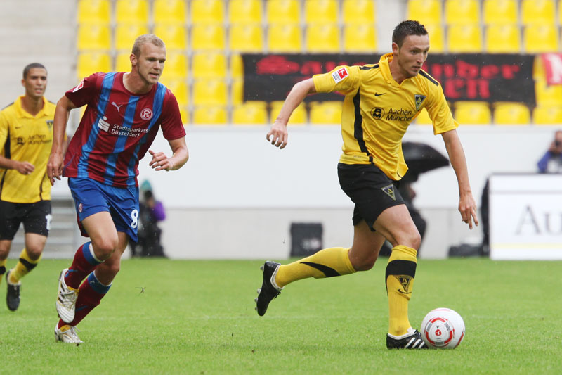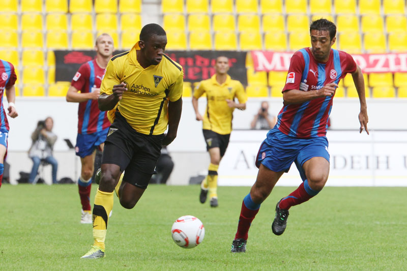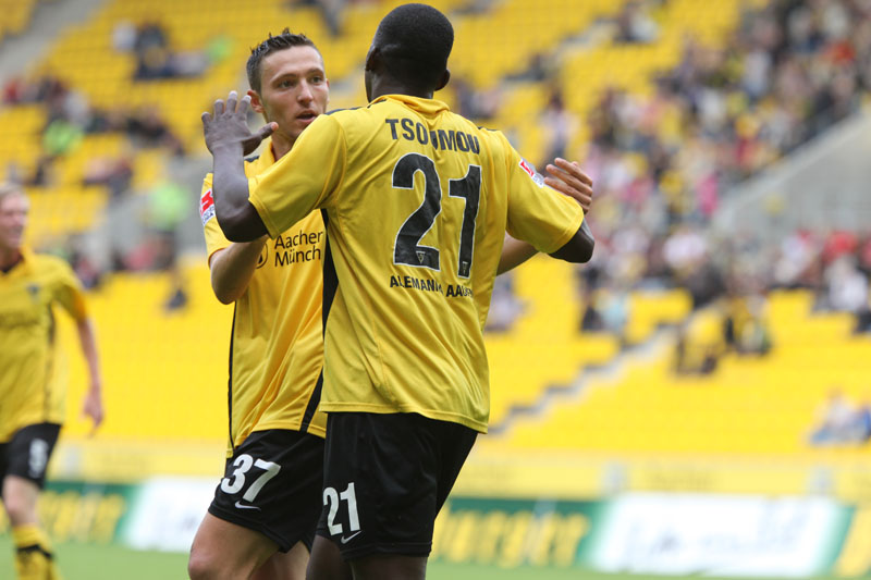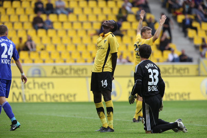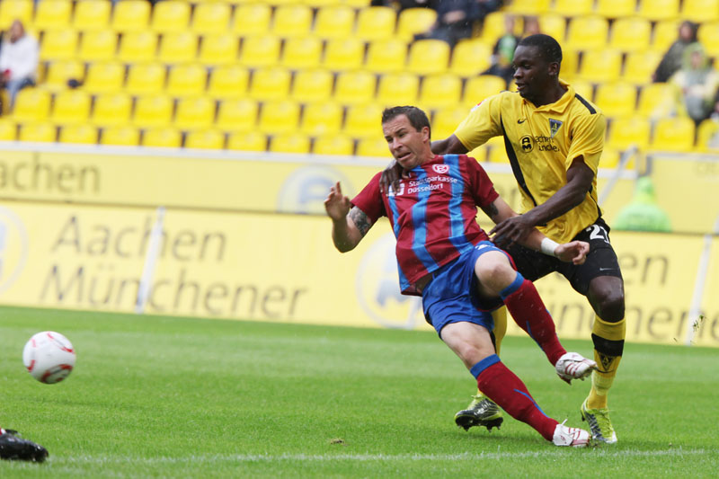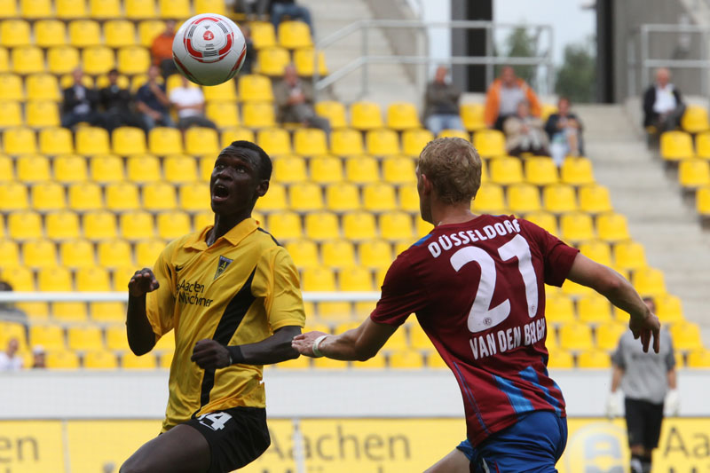 Die Alemannia begann offensiv und druckvoll nach vorne. Babacar Gueye nahm sich nach wenigen Sekunden ein Herz und versuchte es aus der Distanz, doch Fortunas Schlussmann Michael Ratajczak hatte keine Probleme. Die erste dicke Chance zur Führung hatten dann aber die Gäste aus Düsseldorf: Sandor Torghelle erhielt die Kugel an der Strafraumgrenzte und setze den Ball gefühlvoll an die Latte (4.). Nur sechs Minuten später durften die Alemannen über den ersten Torerfolg im eigenen Stadion jubeln: Eine Flanke von Stieber erreichte Junglas, der per Kopf nicht richtig an den Ball kam. Neuzugang Juvel Tsoumou war allerdings aufmerksam und bescherte aus elf Metern die Führung für die Jungs vom Tivoli (10.)
