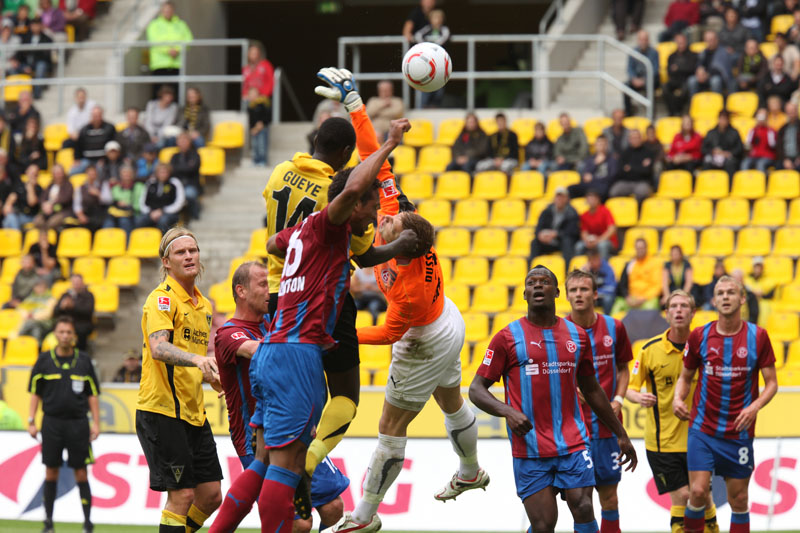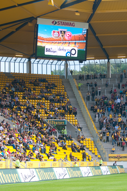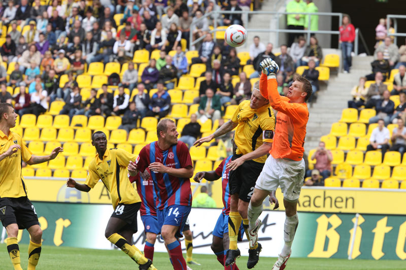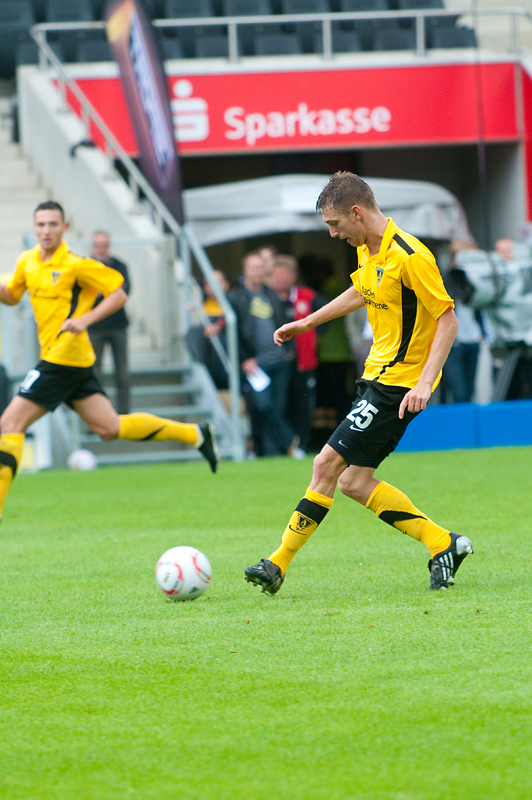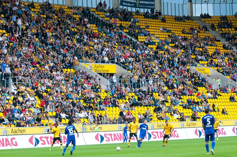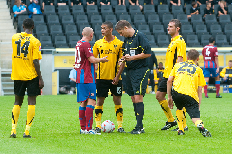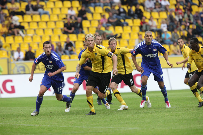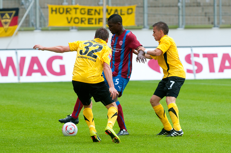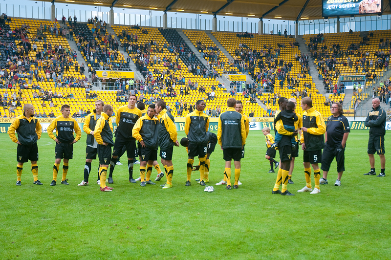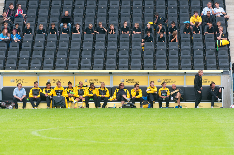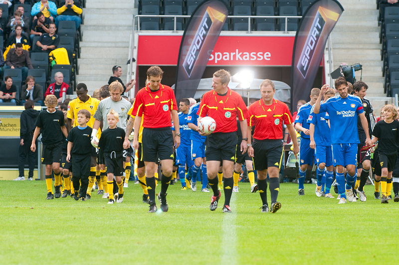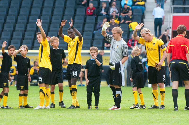 Den Anfang des Turniers machten die Schwarz-Gelben gegen die Fortuna aus Düsseldorf. Trainer Peter Hyballa musste in seinem ersten Spiel vor heimischer Kulisse auf Benny Auer (Innenbandanriss), Thorsten Burkhardt (Adduktorenprobleme), Mirko Casper (Beschwerden an der Achillessehne), Florian Müller (Oberschenkel) und Thomas Zdebel (Zerrung) verzichten. Aachens Coach entschied sich zunächst für die Viererkette mit den beiden Innenverteidigern Nico Herzig und Thomas Stehle sowie die beiden Außen Aimen Demai und Timo Achenbach. Im 4-4-2-System mit Raute begann Tobias Feisthammel auf der Sechs. Links durfte Zoltan Stieber, rechts Marco Höger von Beginn an ran. Hinter den beiden Spitzen Babacar Gueye und Juvel Tsoumou sollte Manuel Junglas auf der „Zehn“ für die nötigen Impulse sorgen. Im Kasten stand zunächst Thorsten Stuckmann.
