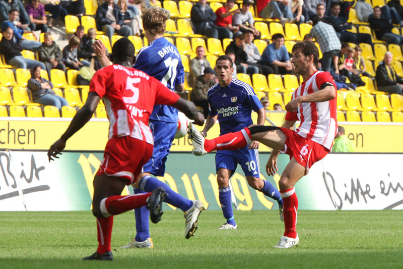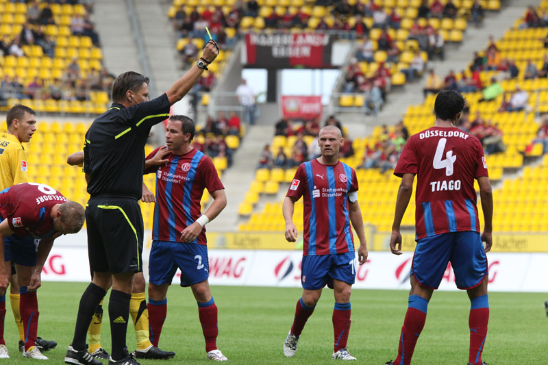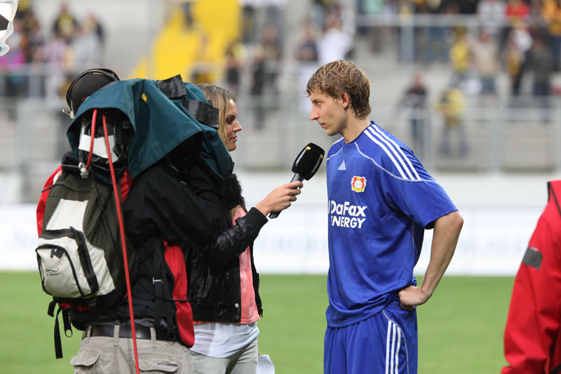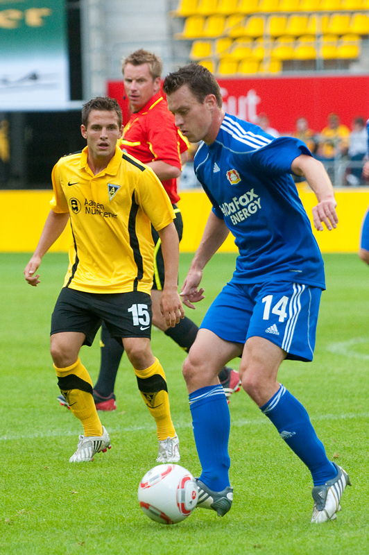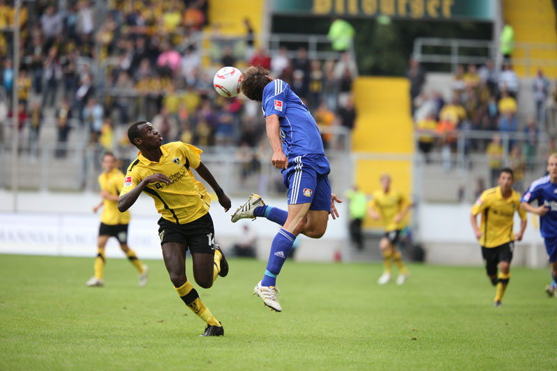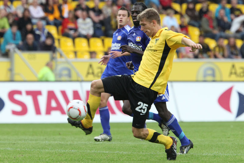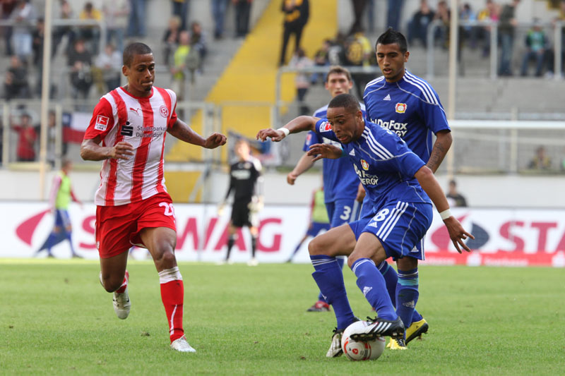 Während das Team von Peter Hyballa daraufhin kurz durchatmen konnte und auf der Tribüne Platz nahm, ging es für die Fortuna gleich weiter. Auf das Team von Norbert Meyer wartete im zweiten Spiel des Tages Erstligist und Europaleague-Teilnehmer Bayer Leverkusen – und die hatten mit Stefan Kießling, Patrick Helmes oder Sami Hyypiä gleich einige Hochkaräter auf dem Platz stehen. Leverkusens Finne stand gleich zu Beginn der Partie im Mittelpunkt, als er eine Hereingabe im eigenen Strafraum mit der Hand bereinigte. Schiedsrichter Thorsten Kinhöfer zeigte ohne zu Zögern auf den Punkt, doch Marco Christ vergab und traf nur den rechten Außenpfosten (3.). Leverkusen hatte im Anschluss daran deutlich mehr Spielanteile, doch es war die Fortuna, die zunächst erfolgreich war: Patrick Zoundi ließ Bayers Keeper Fernandez keine Chance und traf sicher zum 1:0 (22.).