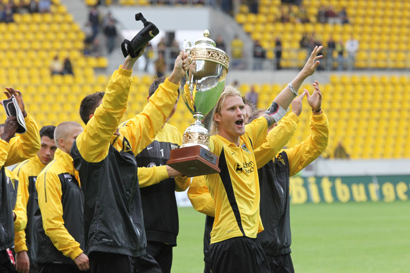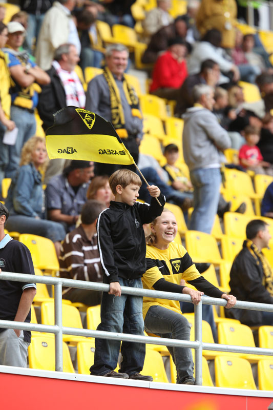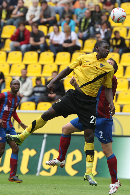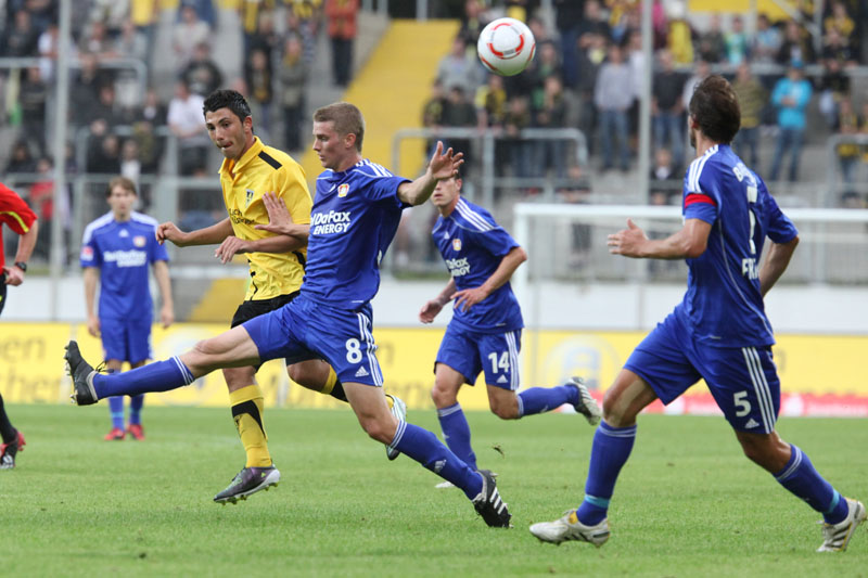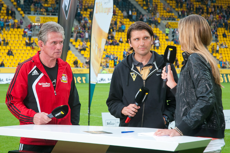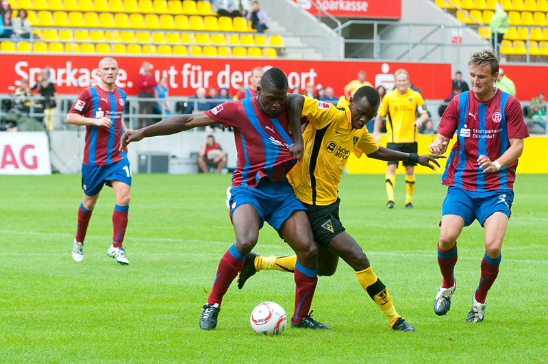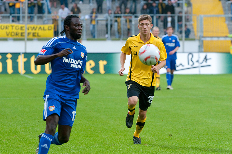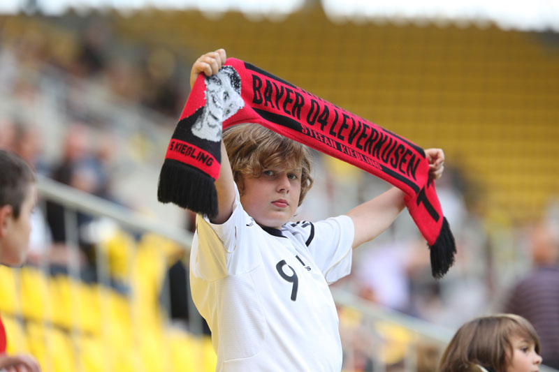 Während das Team von Peter Hyballa daraufhin kurz durchatmen konnte und auf der Tribüne Platz nahm, ging es für die Fortuna gleich weiter. Auf das Team von Norbert Meyer wartete im zweiten Spiel des Tages Erstligist und Europaleague-Teilnehmer Bayer Leverkusen – und die hatten mit Stefan Kießling, Patrick Helmes oder Sami Hyypiä gleich einige Hochkaräter auf dem Platz stehen. Leverkusens Finne stand gleich zu Beginn der Partie im Mittelpunkt, als er eine Hereingabe im eigenen Strafraum mit der Hand bereinigte. Schiedsrichter Thorsten Kinhöfer zeigte ohne zu Zögern auf den Punkt, doch Marco Christ vergab und traf nur den rechten Außenpfosten (3.). Leverkusen hatte im Anschluss daran deutlich mehr Spielanteile, doch es war die Fortuna, die zunächst erfolgreich war: Patrick Zoundi ließ Bayers Keeper Fernandez keine Chance und traf sicher zum 1:0 (22.).