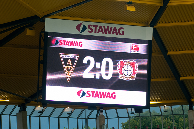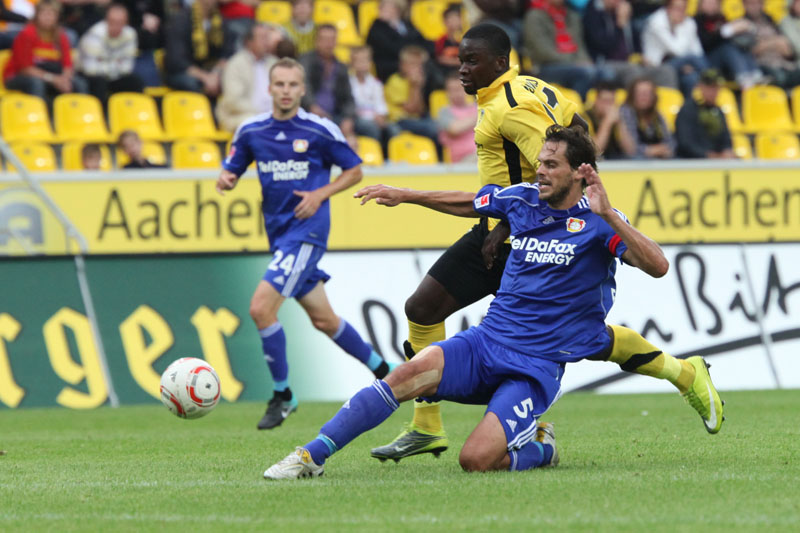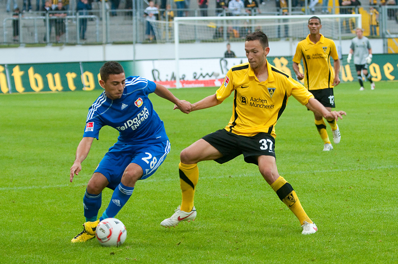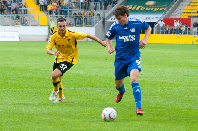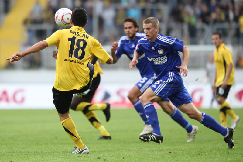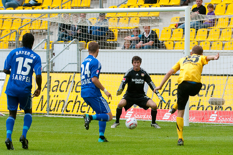 Mit der Führung im Rücken behielt die Alemannia das Tempo bei. Dass Torschütze Gueye es ebenso mit dem rechten Fuß kann, bewies er nur acht Minuten später: Mit einem schönen Distanzschuss zwang er Leverkusens Tomasz Bobel zu einer Parade (10.). Kurz darauf die riesen Chance zum 2:0, und wieder stand Gueye im Mittelpunkt, der nach einem Fehler von Sarpai nur knapp aus fünf Metern verzog. Der Erstligist zeigte sich sichtlich beeindruckt vom Offensivspiel der Alemannia und hatte alle Hände voll zu tun. Uludag setze sich auf der linken Seite durch und flankte auf Junglas, der nur knapp verfehlte (20.).