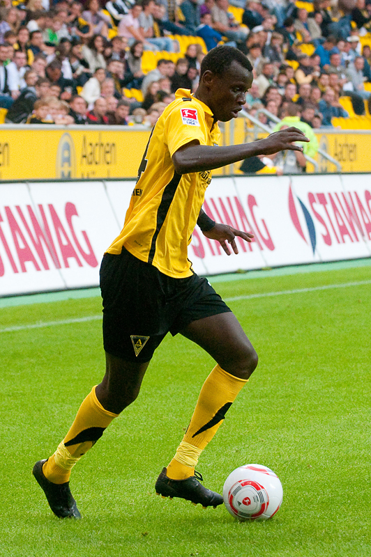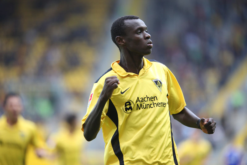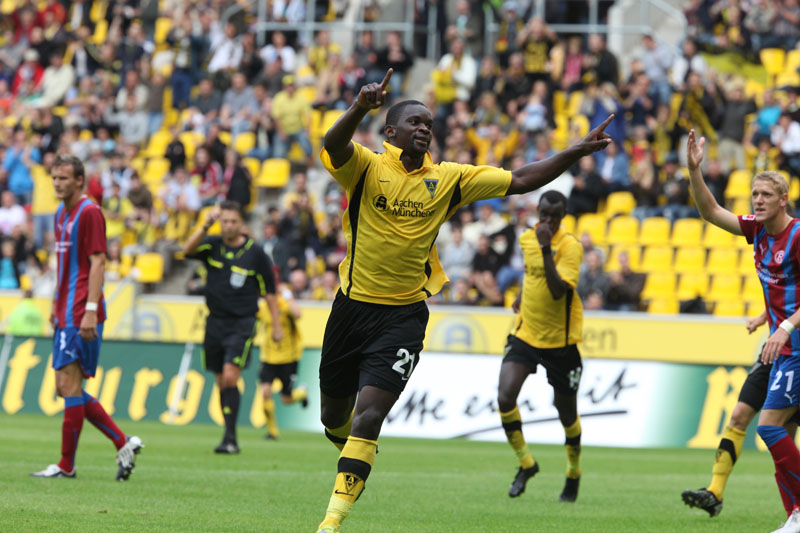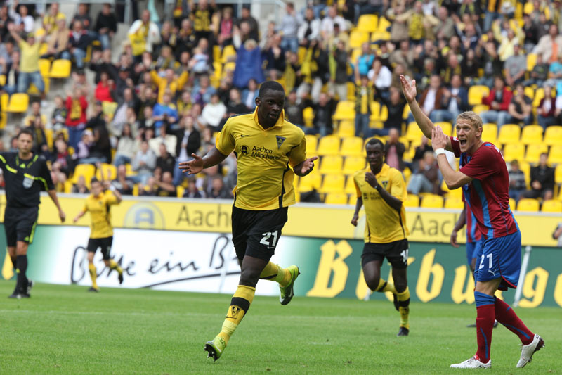 Die Alemannia legte gleich in den ersten Sekunden ein wahres Powerplay an den Tag. Schon nach einer Minute ging ein Torschrei durchs Stadion, als Junglas ins gegnerische Netz traf, doch der Unparteiische hatte ihn im Abseits gesehen. Richtig dynamisch ging es gleich weiter: Mit starkem Pressing ließen die Schwarz-Gelben dem Favoriten kaum eine Chance, das Spiel in Ruhe aufzubauen. Arslan setze energisch nach, erkämpfte den Ball und bediente Gueye, der mit einem trockenen Linksschuss das viel umjubelte 1:0 markierte (2.).