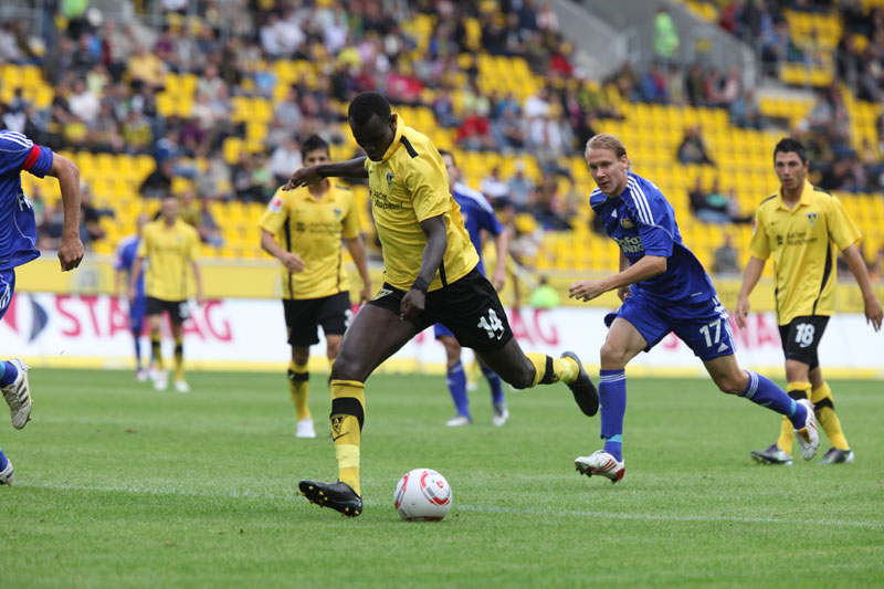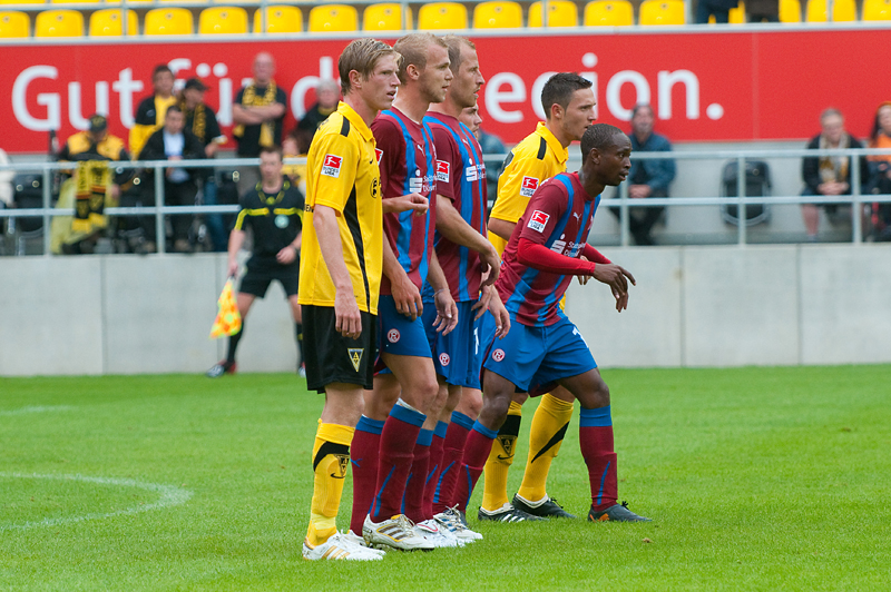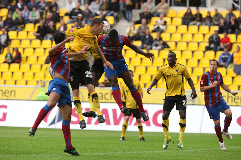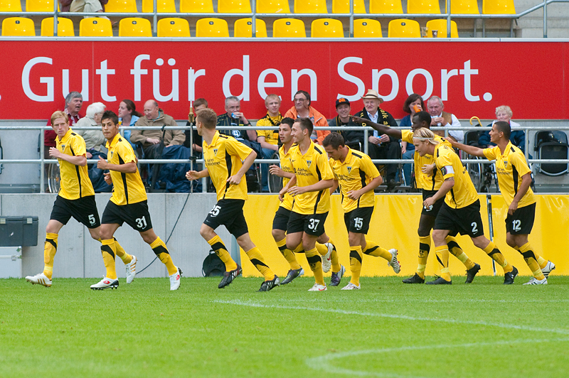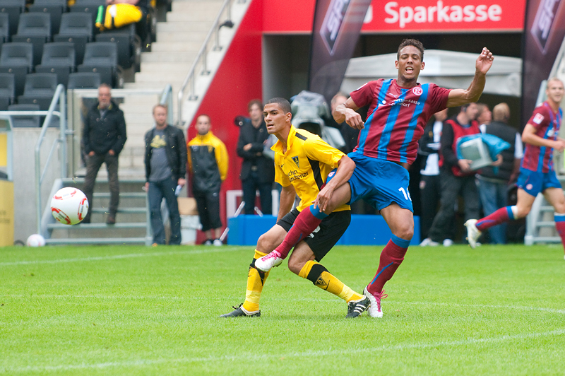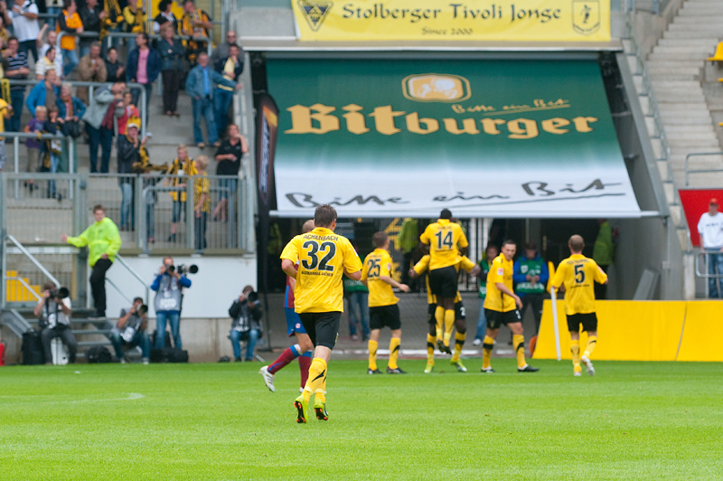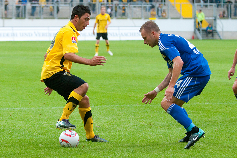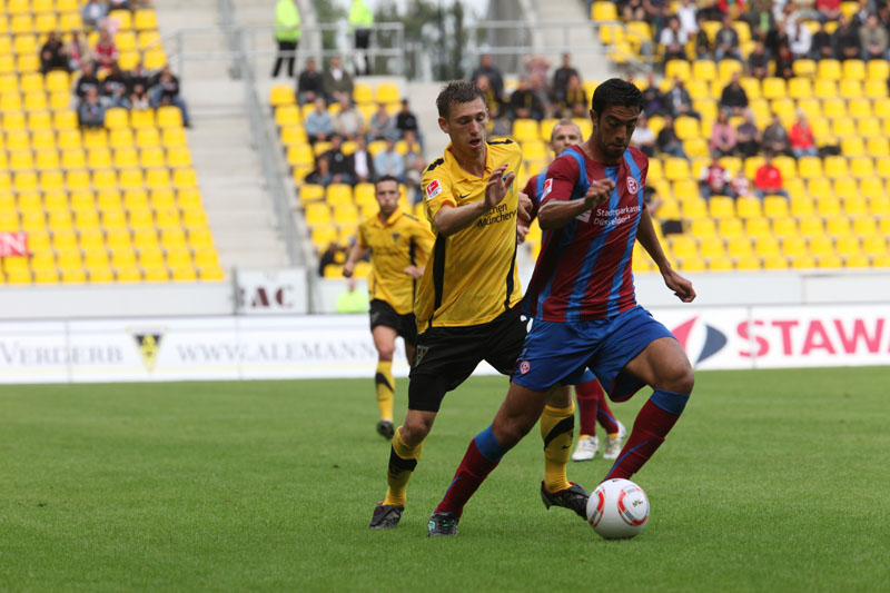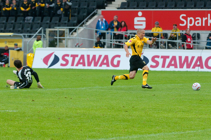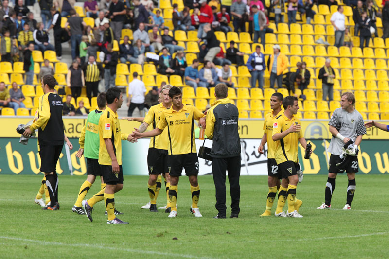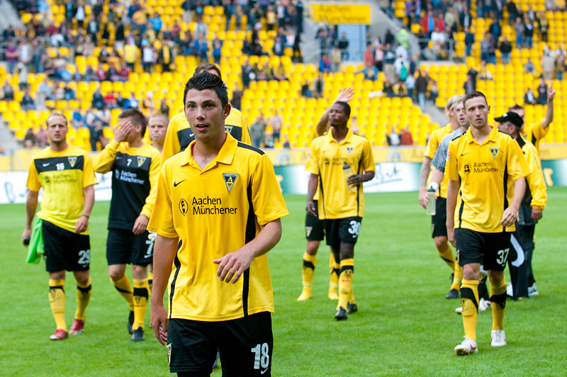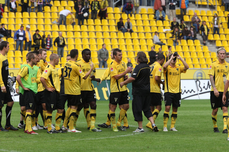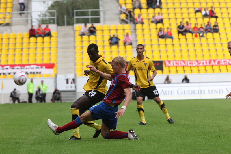 Trotz Unterzahl gaben sich die Gäste aus der Landeshauptstadt nicht mit dem Ergebnis zufrieden. Zunächst versuchte es Zoundi mit einer Direktabnahme (33.), ehe Herzig in letzter Sekunde per Kopf vor dem heraneilenden Wellington klärte und die Kugel unfreiwillig an den rechten Pfosten setze (36.). Den Auftaktsieg ließ sich die Alemannia dann aber nicht mehr nehmen und ging nach ersten 45 überzeugenden Minuten als Sieger vom Feld.