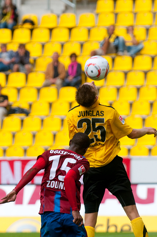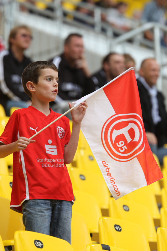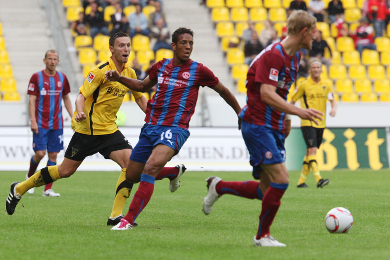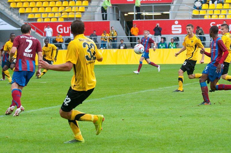 Schon früh zeichnete sich ab, dass beide Teams den Bitburger Derby Cup als Test sehr ernst nahmen. Schnell vorgetragene Angriffe, bissige Zweikämpfe: Von langsamen Abtasten konnte keine Rede sein. Düsseldorfs Wellington verpasste in der 13. Minute nur knapp den Ausgleich, als er einen Schritt vor der Torlinie zu spät kam. Auf der anderen Seite gelang es den Schwarz-Gelben die gegnerische Abwehrkette immer wieder mit schnellem Spiel in Verlegenheit zu bringen. Der zuvor bereits verwarnte Calvano wusste sich in der 23. Minute erneut nur durch ein Foul gegen Junglas zu helfen und erhielt folgerichtig die Ampelkarte.